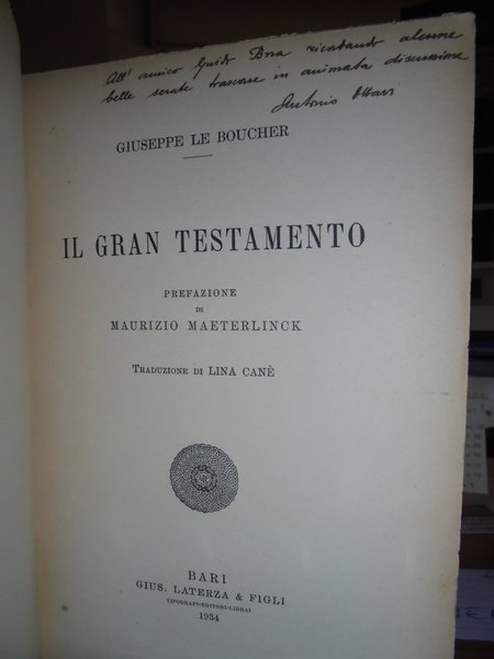 Giuseppe, Le Boucher. Bari, Gius. Laterza & Figli, 1934. Il Gran Testamento. Prefazione di Maurizio Maeterlinck. Traduzione di Lina Canè. In-8°, br. orig. xv, 120 pp. Ben conservato con una dedica firmata al vertice del frontespizio. Neg. mob. nero 9
