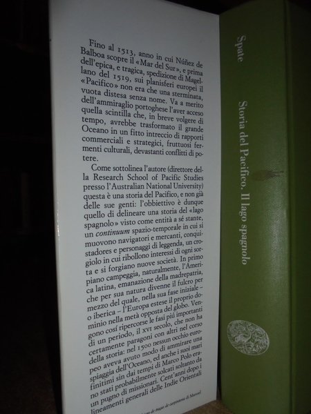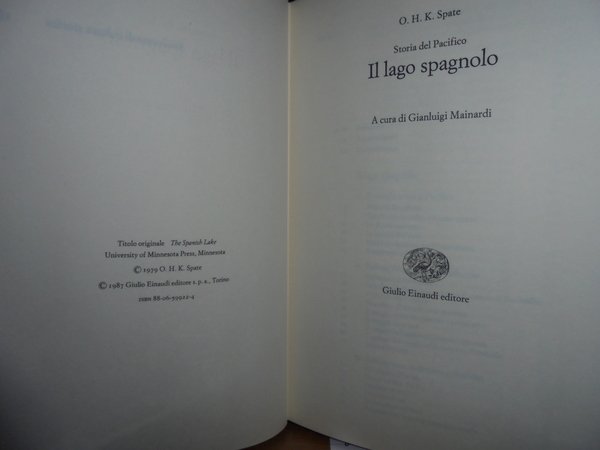 O.H.K. Spate. Torino, Storica Einaudi, 1987. Il Lago Spagnolo. Storia del Pacifico (secoli XVI-XVII). A cura di Gianluigi Mainardi. In-8°, tela verde edit. con sovracopertina. xxvi, 412, (5) pp. In ottimo stato di conservazione. Neg. mob. 14 alto.