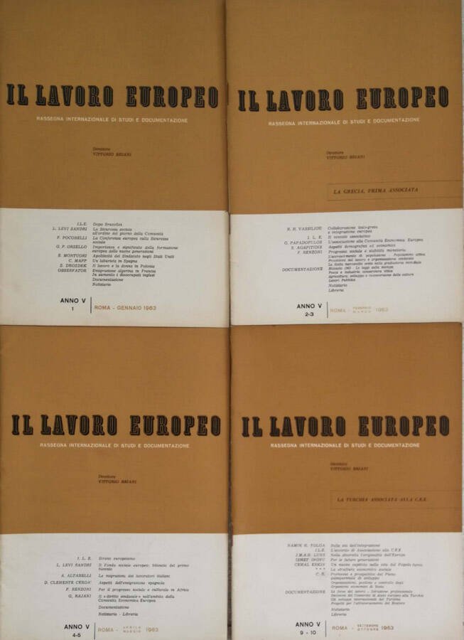 Numeri "1" "2-3" "4-5" e "9-10" dell'anno V della rassegna internazionale di studi e documenti "Il lavoro europeo"; rispettivamente di gennaio, febbraio-marzo, aprile-maggio, settembre-ottobre del 1963. Direttore responsabile Vittorio Briani. Le copertine, illustrate e leggermente ingiallite dal tempo, presentano lievi e quasi impercettibili segni di usura ai margini. Pagine lievemente ingiallite, testo a colonne. Numero pagine complessive 134.