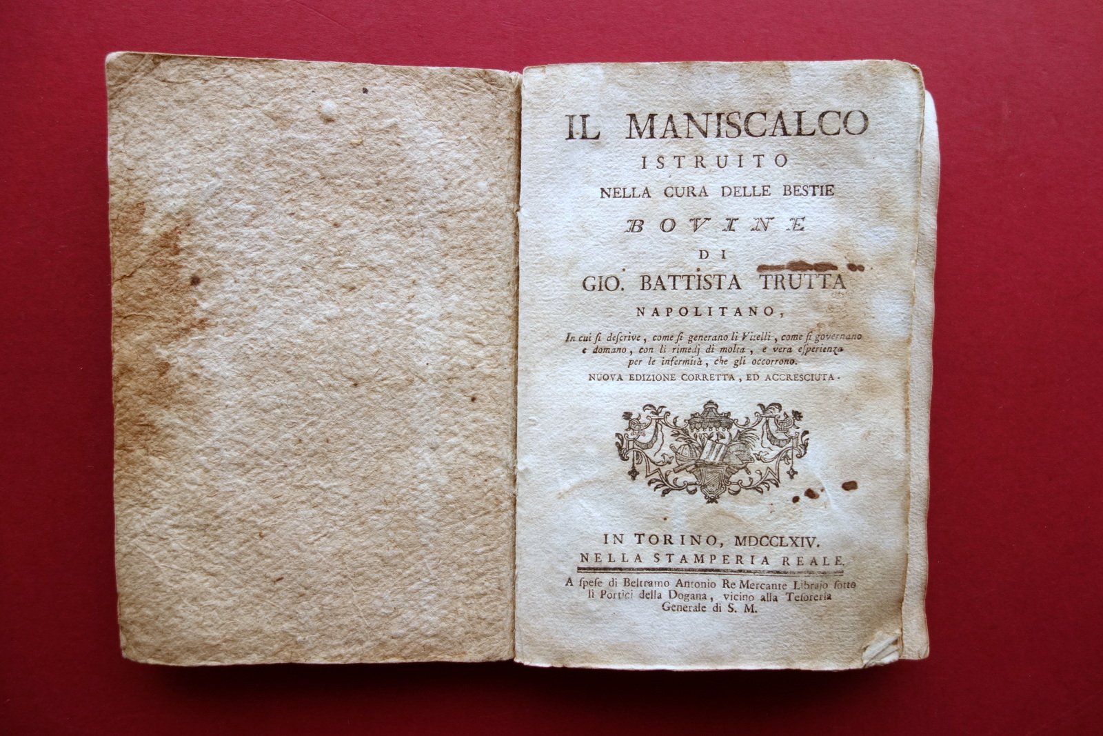 Settecentina, Il maniscalco istruito nella cura delle bestie bovine di Gio. Battista Trutta napolitano in cui si descrive, come si generano li vitelli, come si governano e domano, con li rimedi di molta, e vera esperienza per le infermità, che gli occorrono nuova edizione corretta, ed accresciuta Nella Stamperia Reale, Torino 1764; cm 17x11; pp. 152; frontespizio con una piccola ill. xilografica. Legatura d'epoca in cartoncino muto rivestito in bella carta varese. Condizioni di conservazione Esemplare complessivamente in buono stato con tracce d'uso e del tempo, coperta con alcune minime lievi abrasioni e mancanze al rivestimento cartaceo, una leggera macchia al piatto ant.; cuciture visibili al dorso (vedi foto). Interni buoni con leggere bruniture e, ad alcune pagine, lievi aloni e/o ombre di gore che non compromettono il testo; pp. 81-96 staccate dal corpo del testo, esemplare peraltro compatto. SETT205.L19377 N