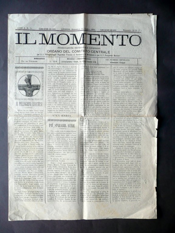 Periodico, Il Momento" Pubblicazione settimanale livornese Organo del Comitato Centrale per il 1° Pellegrinaggio Regionale Toscano al Santuario di Montenero e per il 1° Congresso Mariano Anno II - Numero 74 Livorno, 14 Luglio 1895 Tipo-Litografia "L'Unione", Livorno 1895, cm 49x35,5, pp. non num. (pp. 4, bifolio); numero completo. Condizioni di conservazione Esemplare ben conservato con tracce d'uso, pieghe di conservazione, qualche margine e angolo con alcuni minimi strappetti e tracce di pieghette. Numero completo. SC03.D11514 N "