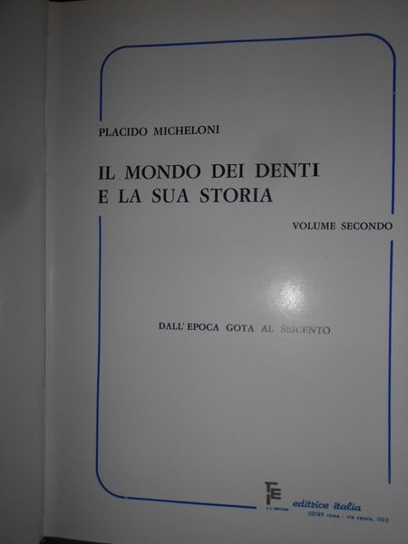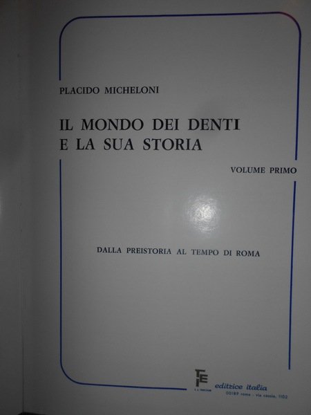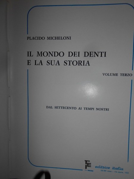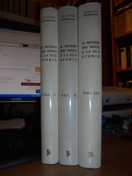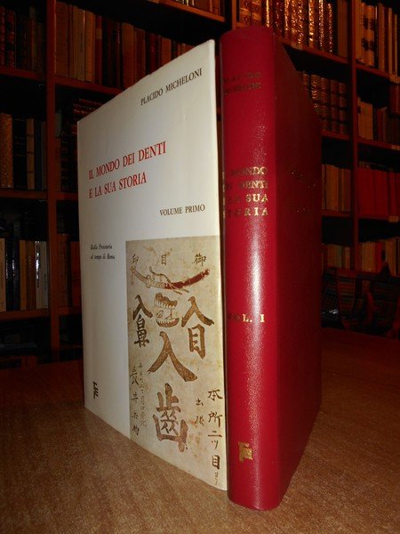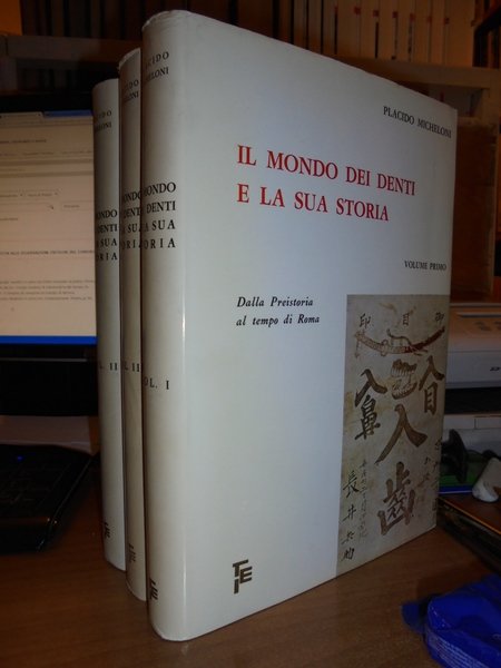 Placido, Micheloni. Roma, Editrice Italia, 1976 - 1979. Il Mondo dei Denti e la sua Storia. Dalla Preistoria ai tempi nostri. In-8°, grande, 3 volumi in pelle rossa con titoli in oro. xviii, (ii), 402, (2) pp.; x, da pp. 403 a pp. 836, (4) pp.; ix, (iii), da pp. 837 a pp. 1257, (3) pp., con numerose illustrazioni anche a colori nel testo. Ottimo esemplare. Uff. C - IV - 5