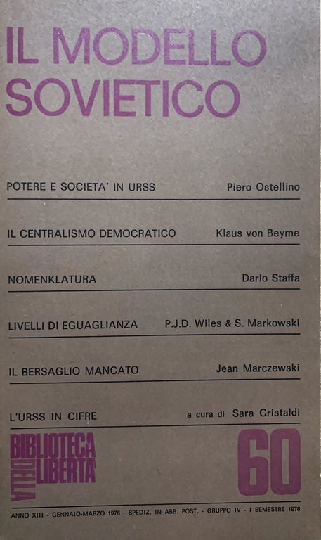 I ed. della rivista pubblicata dal 1964 nell'ambito dell'attività culturale del Centro di ricerca e documentazione Luigi Einaudi di torino (Il saggio di Klaus von Beyme è già apparso su "Government and Opposition", vol. 10, n. 3). Anno XIII, n. 60, Gennaio-Marzo 1976. Direzione, Redazione e Amministrazione: Torino, corso Appio Claudio 7). VIII/ (2)+144+(14) di informazione editoriale, anche illustrate in nero/ copertina in cartoncino tortora con grafica in nero e magenta. Con tabelle in nero nel testo. Stato buono (lieve usura della copertina ai margini). Indice: Editoriale - Potere e società in URSS; Piero Ostellino - Il centralismo democratico; Klaus vom Beyme - Nomenklatura: il reclutamento dei dirigenti; Dario Staffa - Livelli di eguaglianza; P.J.D. Wiles & S. Markowski - Il bersaglio mancato; Jean Marczewski - L'Unione Sovietica in cifre; Sara Cristaldi.