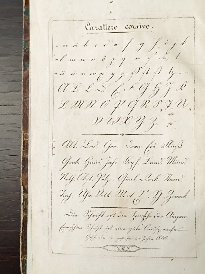 In-8° (cm. 20,5), cartonato coevo marmorizzato (alcune abrasioni ai piatti, dorso senza marmorizzatura); pp. IV 192 in stato molto buono (lievi e sporadiche fioriture, piccolissime macchiette); con 1 tavola in rame all'antiporta fuori testo riportante «Il carattere corsivo» (piccola mancanca al margine interno senza fastidio). Terza e non comune edizione «corretta e migliorata con nuovo Esemplare di Scrittura Tedesca». Buon esemplare. (NB9)