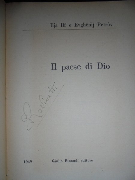 Ilià, Ilf e Eughénij Petròv. Torino, Giulio Einaudi, 1949. IL PAESE DI DIO. In-8°, cart. edit. 463 pp. In buono statodi conservazione con la carta leggermente ingiallita. Neg. magazz. mob. grigio.