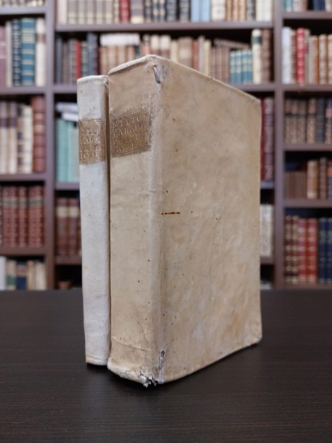 <span style="font-style: normal;">2 volumi in-12° (cm. 15), legatura coeva in piena pergamena con titolo in oro su tassello ai dorsi, tagli spruzzati; pp. 132, 228 in stato molto buono (alcune fioriture). Vignette incise ai frontespizi. Il primo volume corredato di 14 tavole fuori testo con eleganti incisioni in rame a piena pagina, di cui una scena allegorica incisa all'antiporta fuori testo e una tavola con il ritratto dell'autore in tondo. «</span><i>Poema tradotto dal sig. Paolo Rolli con le annotazioni di G. Addison e alcune osservazioni critiche</i><span style="font-style: normal; font-size: 13.3333px;">»</span>. Edizione non comune. Esemplare molto buono. (NA4)