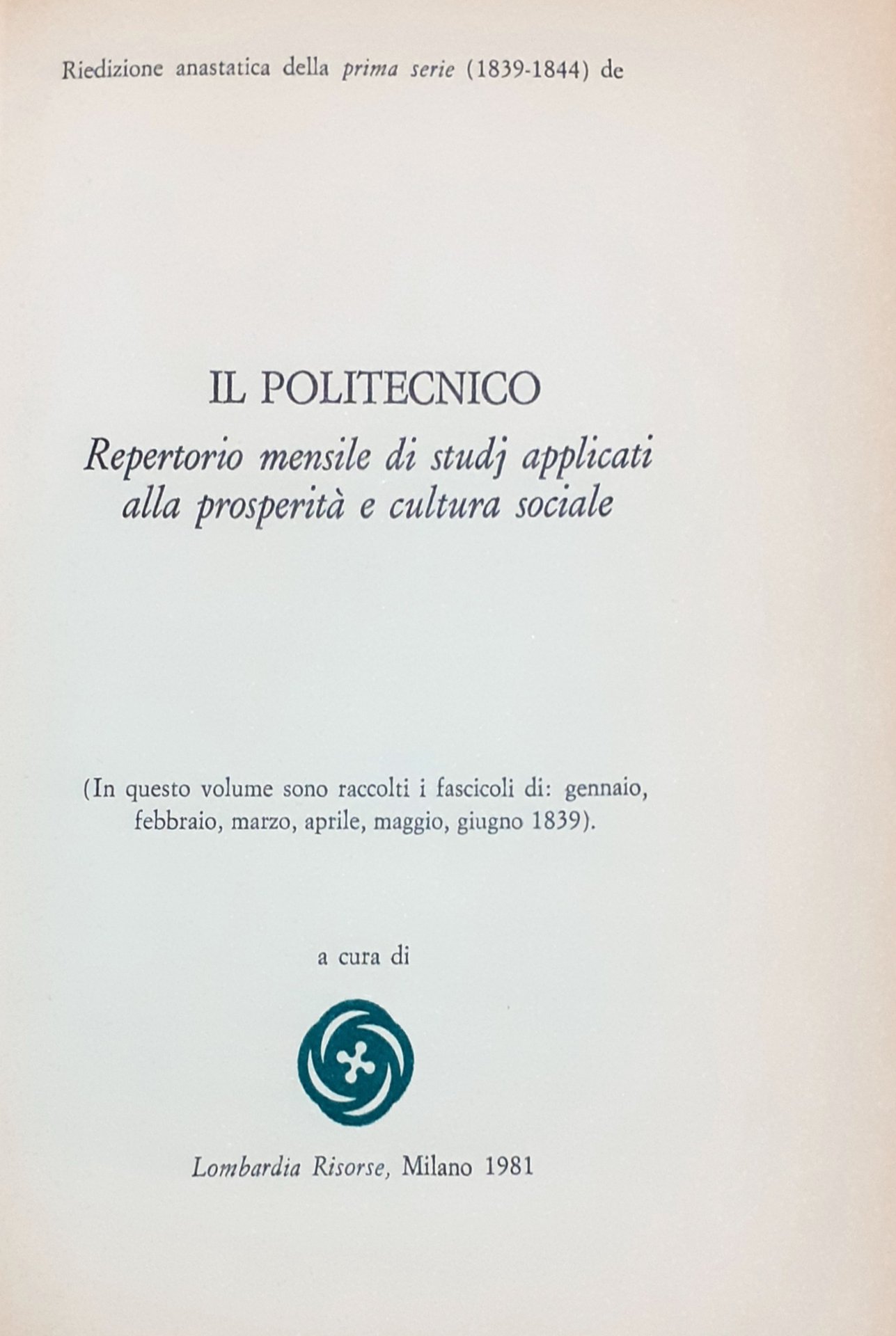 Il Politecnico. Repertorio mensile di studj applicati alla prosperità e cultura sociale Volume I. Anno I - Semestre I (In questo volume sono raccolti i fascicoli di: gennaio, febbraio, marzo, aprile, maggio, giugno 1839)