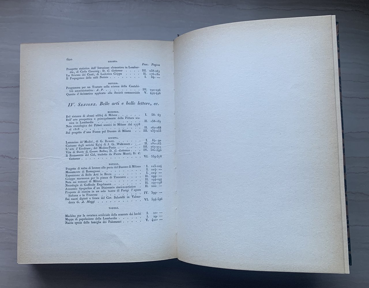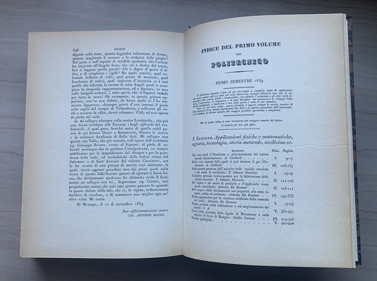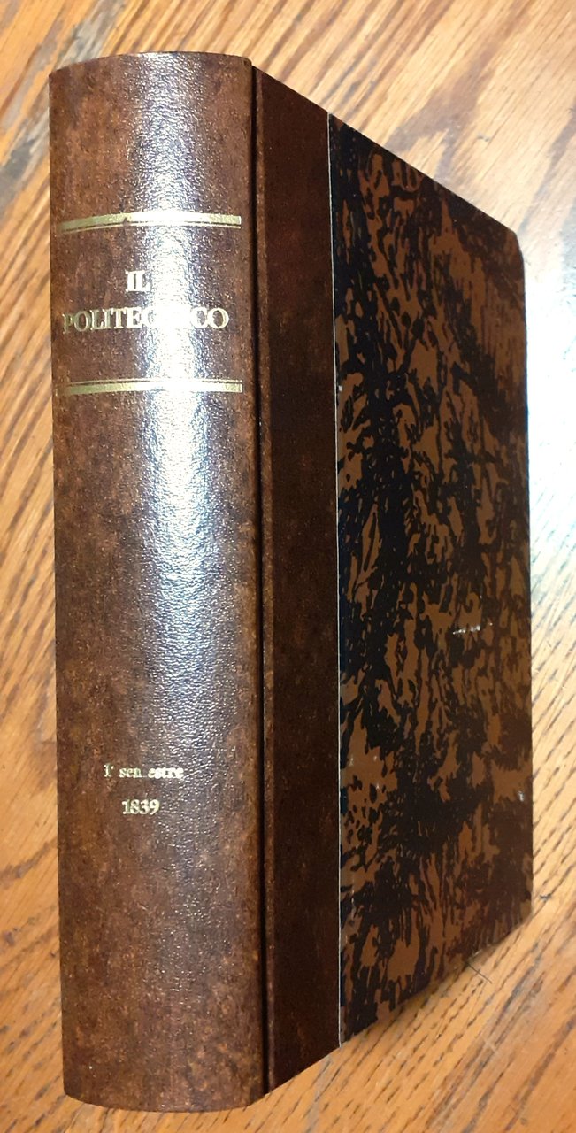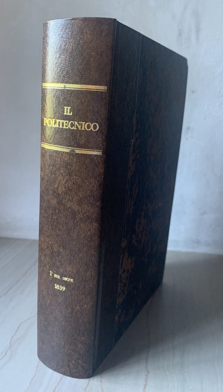 riedizione anastatica aprile 1981 della prima serie (1839-1844) de Il Politecnico: in questo volume sono raccolti i fascicoli gennaio-giugno 1939 (Anno I - Semestre I). VIII/(12)+600+(8)=620/ rilegato (dorso rifinito in simil pelle marrfone con titoli dorati - piatti in carta marrone screziata in nero). Con tabelle in nero nel testo e con due tavole ripiegate illustrate, di cui una a colori. Stato buono (pagine lievemente brunite ai margini). Indice del primo volume del Politecnico, primo semestre 1839: I Sezione. Applicazioni fisiche e matematiche, agraria, tecnologia, storia naturale, medicina ec. - II. Sezione. Arte sociale, studj economici, amministrativi, legali, istorici, ec. - III. Sezione. Studj mentali, metodi d'istruzione, nuovi instituti, ec. ec. - IV Sezione. Belle arti e belle lettere, ec..
