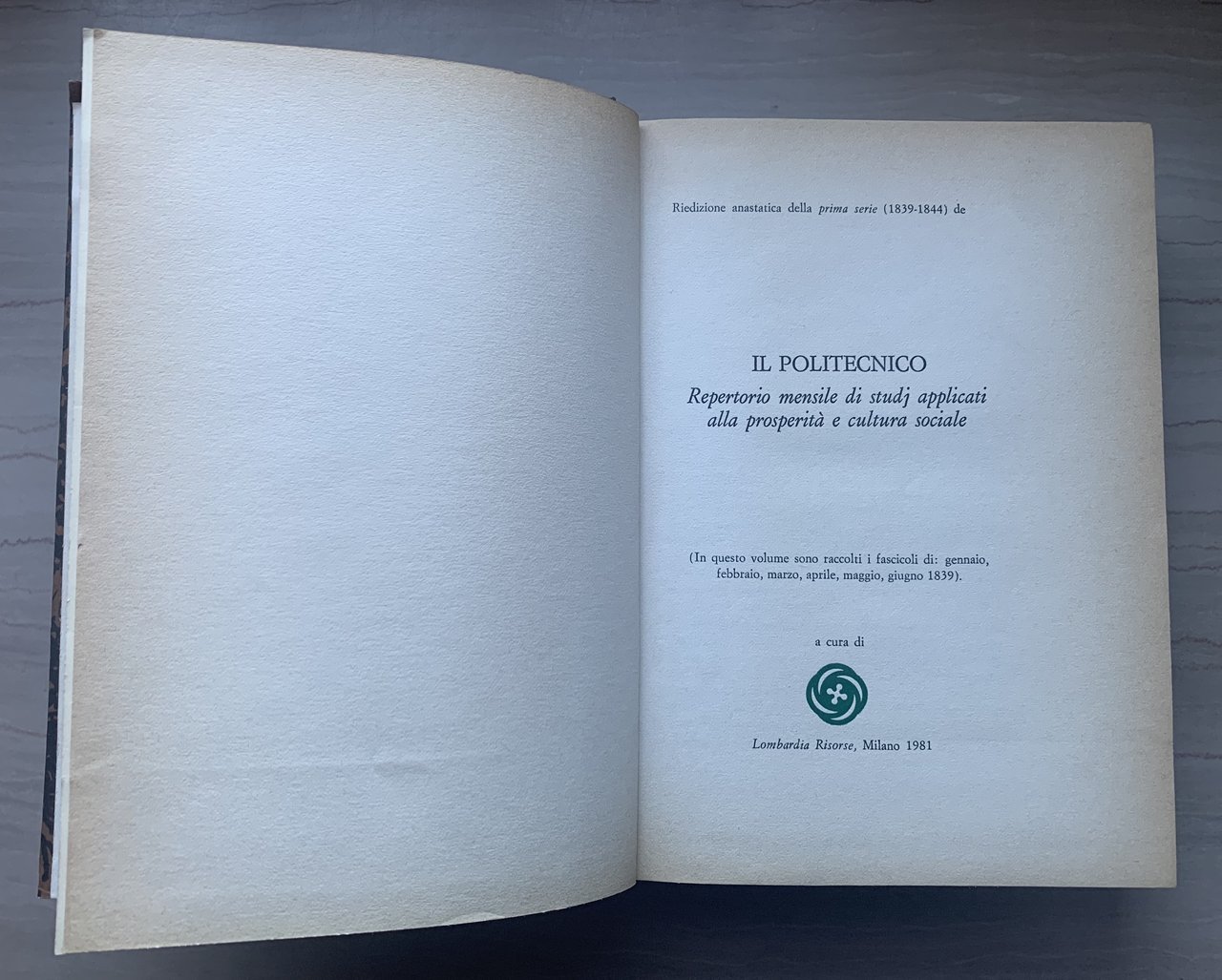 • Novecento ristampe anastatiche, raccolte periodici, periodici, scienze, Il Politecnico Anno Primo Semestre Primo 1839, Lombardia Risorse Milano 1981
