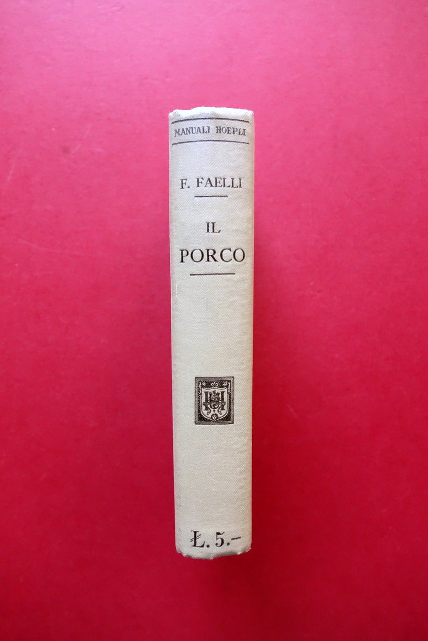 Ferruccio Faelli, Il Porco razze - allevamento - industrie con 100 incisioni e 5 tavole Hoepli, Milano 1911; cm 15x10,5; pp. XX-462-64 (elenco del pubblicato della casa ed. Hoepli), con 100 fig. in b/n nel t. e fuori t. e con 5 tavv. in b/n fuori t.; tutta tela ed. ill. a colori, sovraccoperta ed. cartacea. Sovraccoperta ed., piatto anteriore, frontespizio, pagina 1 con ex libris del precedente proprietario. Prima edizione. Condizioni di conservazione Volume complessivamente molto ben conservato con leggere tracce d'uso. Interni anch'essi molto ben conservati con minimi accenni di bruniture a qualche pagina. Sovraccoperta ed. in buono stato con leggere tracce di sporco, alcuni piccoli marginali strappetti e qualche minima mancanza (vedi foto). Rara prima edizione, corredata della rara sovraccoperta editoriale cartacea con titolo al dorso. Esemplare da collezione. SETT154.L24123 N P