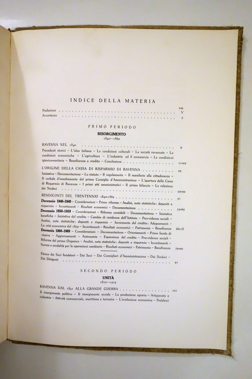AA. VV., Il primo secolo di vita della Cassa di Risparmio di Ravenna 1840 - 1940 Arti Grafiche, Bergamo 1941; cm 34,5x25; pp. 356 con LXXVI belle tavv. fotografiche in b/n a piena pagina; tutta tela ed. grezza con, al piatto ant., titolo impresso in rosso e blasone in pelle applicato. Condizioni di conservazione Buone condizioni con tracce d'uso, coperta con alcune lievi tracce di sporco e qualche minimo strappetto / sfilacciatura alla tela. Interni buoni con, ad alcune pagine, lieve / leggero ingiallimento del tempo. Poche minime bruniture. Monumentale storia del primo secolo di vita della Cassa di Risparmio di Ravenna. Edizione notevolmente curata sotto l'aspetto grafico, riccamente illustrata. SETT102.L25169 N