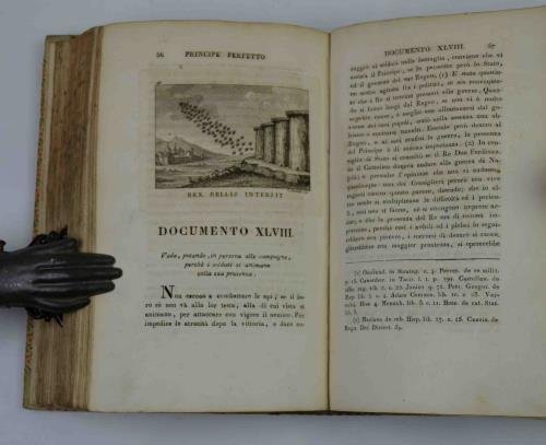 Due volumi legati in uno di cm. 22, pp. (8) xv (1) 311 (1); 370. Con un ritratto all'antiporta di ciascun volume raffigurante Maria Luisa, Infanta di Spagna, e Carlo Lodovico di Borbone. Gli 80 capitoli in cui e suddiviso il testo sono inoltre tutti preceduti da una graziosa incisione a mezza pagina. Solida legatura coeva in mezza pergamena con piccole punte e titoli su tassello al dorso. Qualche macchietta sparsa e poche tracce d'uso, complessivamente buono stato di conservazione generale. Stimata traduzione italiana dell'opera di Andrés Mendo: "El Principe Perfecto y Ministros Ajustados. Documentos politicos y morales. En Emblemas" apparso nella metà del '600.