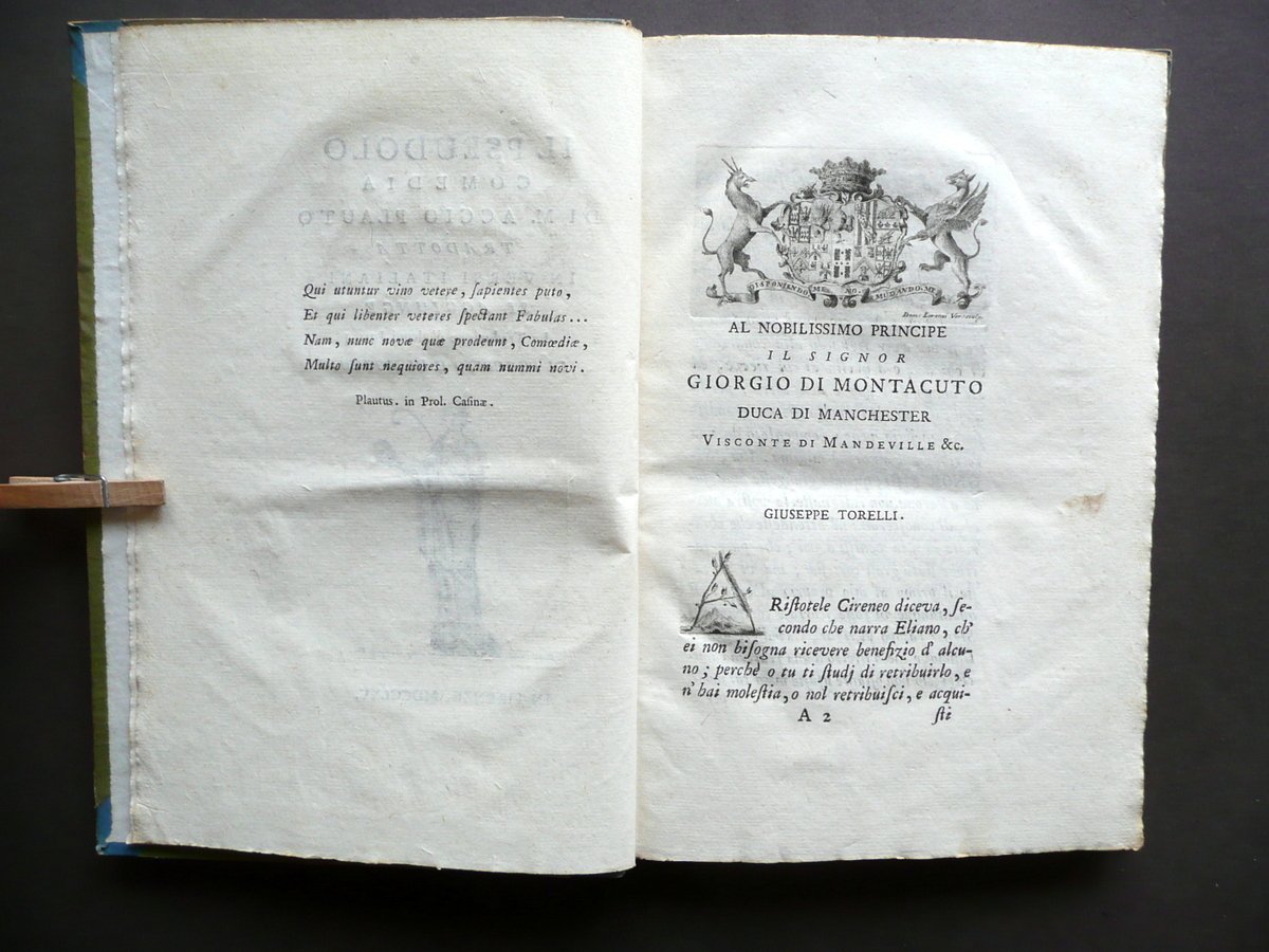 Settecentina, Il Pseudolo Comedia di M. Accio Plauto tradotta in versi italiani si aggiunge la traduzione d'alcuni Idilli di Teocrito e di Mosco Firenze 1765; cm 23x15; pp. XVI-192 con un bello stemma e un capolettera incisi in b/n; frontespizio con una piccola ill. incisa in b/n. Legatura ottocentesca in tutto cartonato con titolo impresso in oro al dorso. Condizioni di conservazione Volume ben conservato con tracce d'uso, coperta con alcune piccole leggere abrasioni e minuscoli leggerissimi aloni. Interni buoni con alcune piccole leggere / lievi bruniture; margini con barbe. SETT146.L14045 N