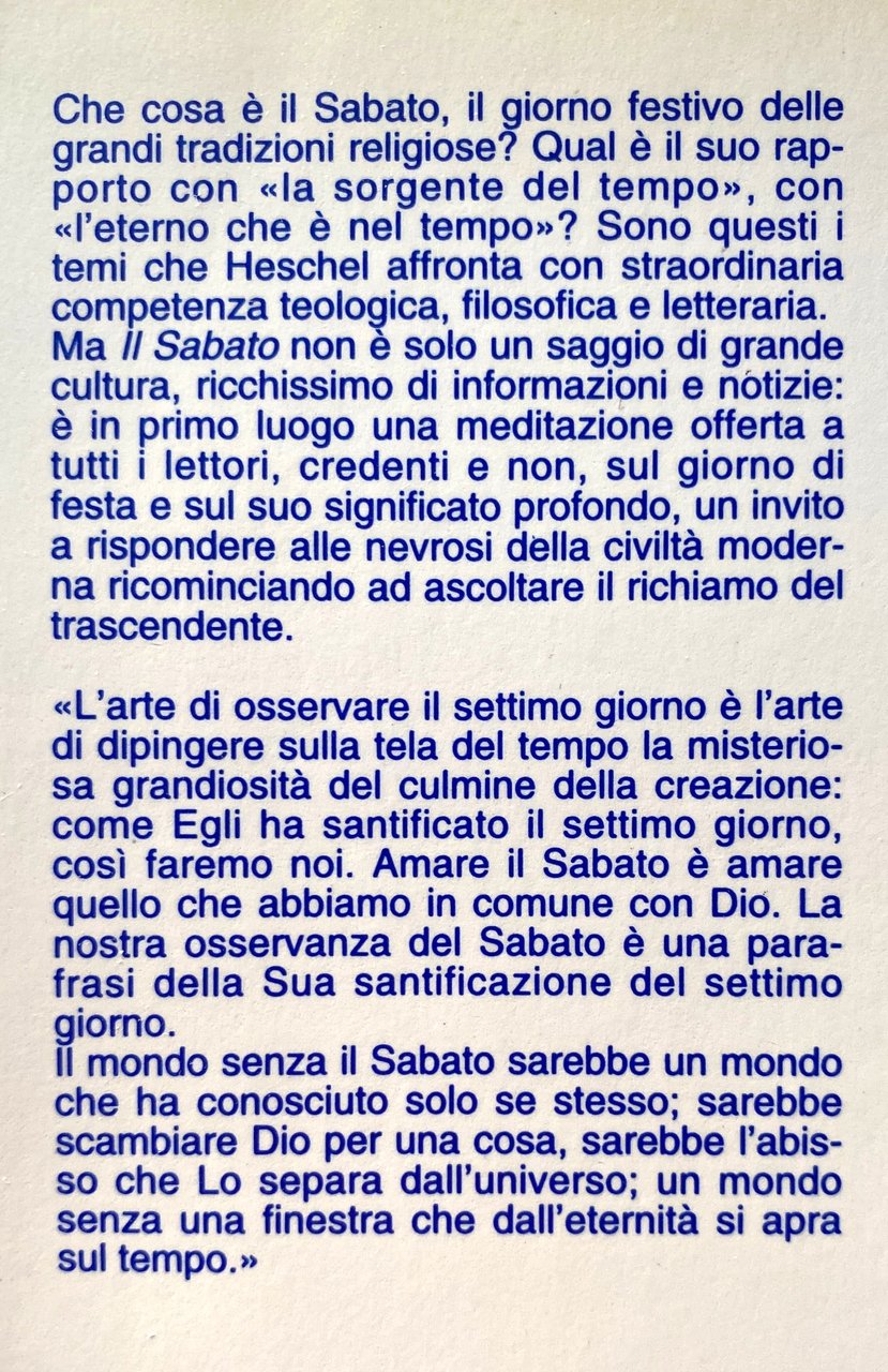 Che cosa è il Sabato, il giorno festivo delle grandi tradizioni religiose? Qual è il suo rapporto con la sorgente del tempo, con l'eterno che è nel tempo? Sono questi i temi che Heschel affronta con straordinaria competenza teologica, filosofica e letteraria. Ma il Sabato non è solo un saggio di grande cultura, ricchissimo di informazioni e notizie: è in primo luogo una meditazione offerta a tutti i lettori, credenti e non, sul giorno di festa e sul suo significato profondo, un invito a rispondere alle nevrosi della civiltà moderna ricominciando ad ascoltare il richiamo del trascendente. L'arte di osservare il settimo giorno è l'arte di dipingere sulla tela del tempo la misteriosa grandiosità del culmine della creazione: come Egli ha santificato il settimo giorno, così faremo noi. Amare il Sabato è amare quello che abbiamo in comune con Dio. La nostra osservanza del Sabato è una parafrasi della Sua santificazione del settimo giorno. Il mondo senza il Sabato sarebbe un mondo che ha conosciuto solo se stesso; sarebbe scambiare Dio per una cosa, sarebbe l'abisso che Lo separa dall'universo; un mondo senza una finestra che dall'eternità si apra sul tempo.
