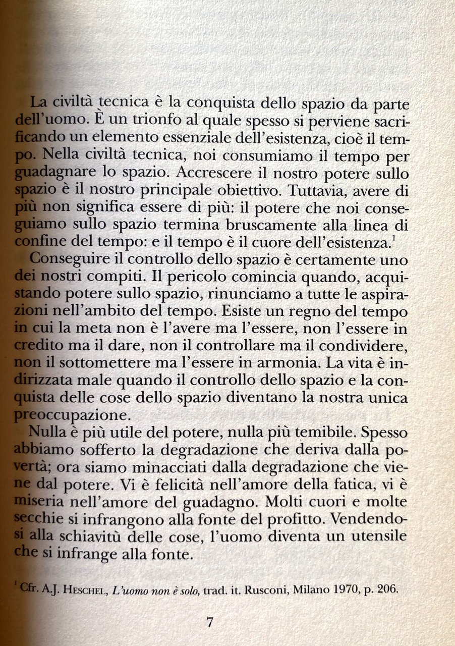 Il sabato è il dono più prezioso che l'umanità abbia ricevuto dal tesoro di Dio. Durante tutta la settimana pensiamo: "lo spirito è troppo lontano", e soccombiamo all'indifferenza spirituale: oppure, nella migliore delle ipotesi, preghiamo: "concedici un po' del tuo spirito". al sabato invece lo spirito ci prega: "accetta da me ogni perfezione".