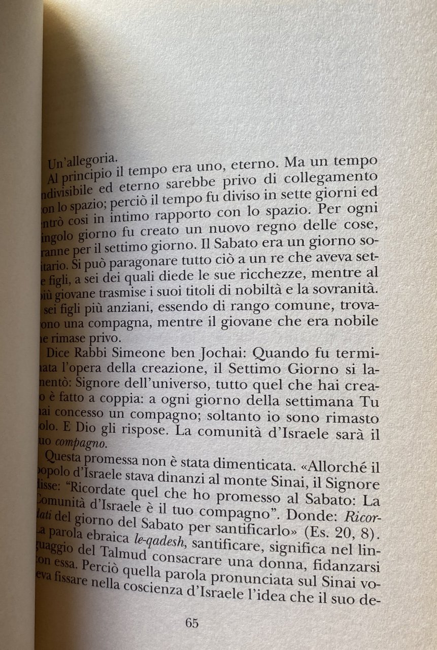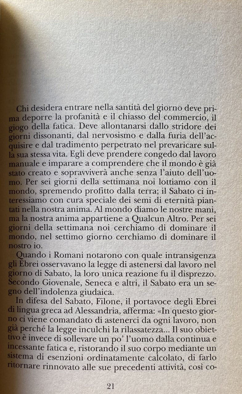 Soggetti: Ebraismo Giudaismo, Teologia, Religione Spiritualità Religioni non-cristiane Culto Riti Cerimonie Feste religiose Feste religiose Saturno Pianeti Simbolismo Cultura ebraica Ore quotidiane Lavoro Riposo Prescrizioni Stanchezza Sei giorni Settimo giorno Settimana Tempo Anima Antichi Benedizione Bibbia Casa Celebrare Compito Concetto Corpo Creazione Israele Eternità Uomo Desiderio divino Filosofia Fuoco Gioia Sabato Legge Luce Luna Mirto momento Natura New York Olam Osservare Pace Pensiero Popolo Preghiera Presenza Dio Promessa Rabbi Simeone Rabbini Regina Regno Sacro Santificare Santità Santo Significato Signore Jochai Spazio Spirito Sposa Storia Temporalità Terra Torah Tecnologia Soldi Denaro Divieti Shabbath Shamor Zakhor Decalogo Esodo Deuteronomio Tradizione orale Sinai Lavori proibiti Mishna Avoth Melakhoth Tabernacolo Deserto Preparazione Cibo Alimenti Vestiti Scrittura Trasporti Oggetti S.R. Hirsch Profeti Transazioni commerciali Affari Nehemia Attività Profano Uvdane Dechol Musica strumentale Nuoto Equitazione Mezzi di trasporto Utensili Strumenti Muqtzè Salmi Ba'alath habbayth Candele Rituali Halachà Cucina Carne Pesce Digiuno Rotolo Torà Aron Haqqodesh Arca santa Qiddush Yiddish Vino Pane Pasto sabbatico Kugel Tcholent Tefina Telefono Studio Oneg E. Weil Derashoth Tannaim Seudà Shelishith Havdalà Ma'ariv Sinagoga Spinoza Pasqua Pesach Tecnica Falsi bisogni Astenersi Bezah Buber Espiazione Venerdì Hagigah Libertà interiore Isacco Luria Isaia Gerusalemme Judah ben Ilai Kabbalat Kiddush Lord Louis Ginzberg Mekilta Menorat ha-Maor Menuha Metafora Midrash Mishnah Mishneh Mitzvot Mosè Nahmanides Nakawa Rabba Akiba Hanina Giuda Shimeon Yohanan Rashi Recitare Rallegrarsi Shimeon ben Yohai Talmud Tannaim Civiltà Dieci Comandamenti Tosafot Wilna Parola Mondo Zohar Mondano Riferimento Bibliografia Saggi religiosi Libri fuori catalogo Collezionismo Negozi chiusi Guadagno Bertrand Russell Barth Romani Cristianesimo Rabbenu Hananel Eduard Mahler Cohen Judaism Theology Religion Spirituality Non-Christian Religions Worship Rites Ceremonies Religious Festivals Religious Festivals Saturn Planets Symbolism Jewish Culture Daily Hours Working Job Rest Prescriptions Tiredness Six Days Seventh Day Week Time Soul Ancients Blessing Bible Home Celebrating Task Concept Body Creation Eternity Man Divine Desire Philosophy Fire Joy Saturday Law Light Moon Myrtle moment Nature Observe Peace Thought People Prayer Presence God Promise Rabbis Queen Sacred Kingdom Sanctify Saint Meaning Lord Space Spirit Bride History Temporality Earth Technology Money Prohibitions Decalogue Exodus Deuteronomy Oral Tradition Forbidden Works Tabernacle Desert Preparation of Food Food Clothes Writing Transport Objects Prophets Commercial Transactions Business Profane Activities Swimming Horseback Riding Means Transport Tools Psalms Candles Rituals Cooking Meat Fish Fasting Scroll Holy Ark Wine Bread Sabbath Meal Telephone Study Synagogue Easter Technique False Needs Abstain Atonement Friday Inner Freedom Isaac Isaiah Jerusalem Metaphor Moses Judah Acting Rejoice Civilization Ten Commandments Word Mundane World Reference Bibliography Religious essays Out of print books Collectibles Closed shops Income Romans Christianity