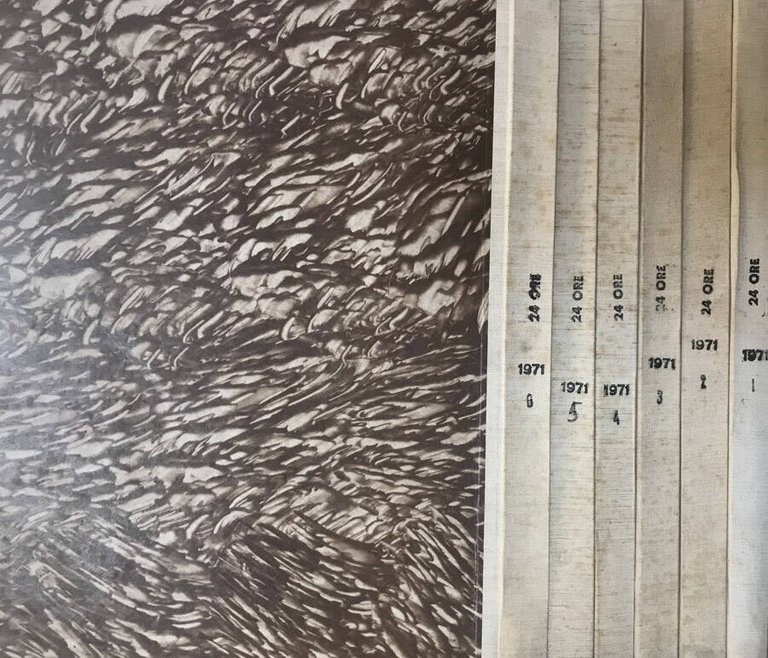 6 Volumi che completano l'anno del 1971 del quotidiano "Il Sole 24 Ore". Rilegature in mezza tela e piatti marmorizzati, in alcuni la numerazione è segnata a penna nel dorso. Quest'ultimi si presentano ingialliti e con fioritura sparsa Numero Pagine