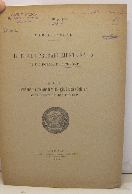 Il titolo probabilmente falso di un poema di Cicerone. Nota letta alla R. Accademia di Archeologia, Lettere e Belle Arti nella tornata del 19 aprile 1899 | Libri antichi e moderni | Pascal Carlo