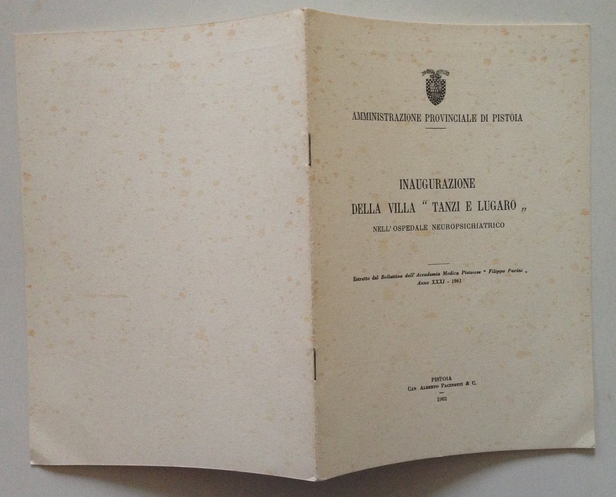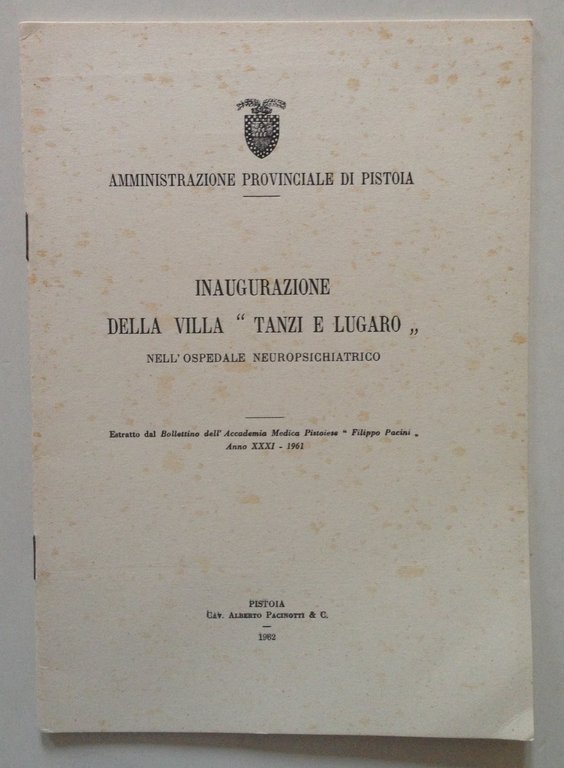 Opuscolo, Inaugurazione della villa Tanzi e Lugaro" nell'ospedale neuropsichiatrico Cav. Alberto Pacinotti & C., Pistoia 1962, cm 24x17, pp 23, ill. in b/n n.t. e a p.pag., estratto dal Bollettino dell'Accademia Medica Pistoiese "Filippo Pacini" anno 31-1961, br. ed. Condizioni di conservazione. Esemplare in buono stato con leggere tracce d'uso; brossura con qualche macchietta di brunitura. OPEB.3136 MT "