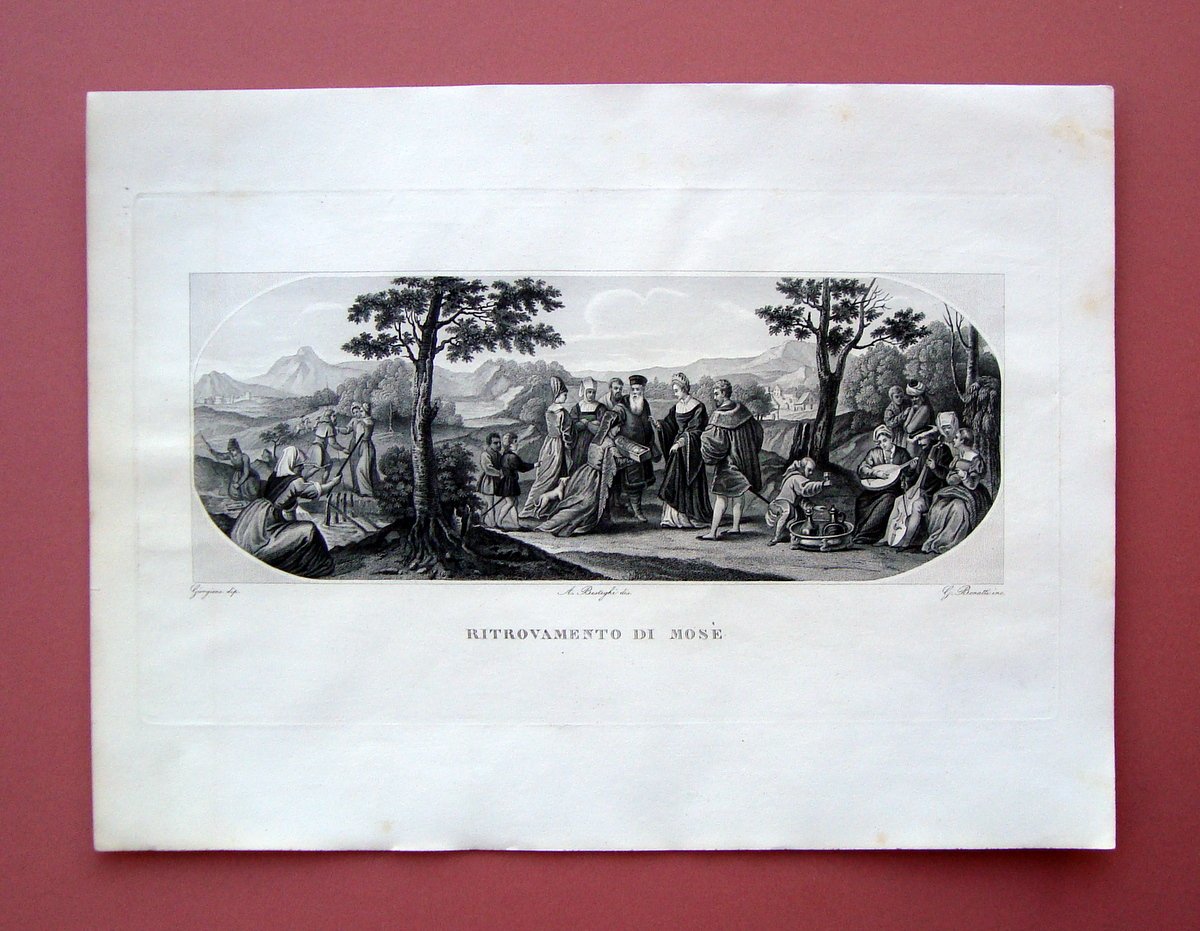 Incisione su rame d'epoca 1842 , RITROVAMENTO DI MOSE' Da un dipinto di Giorgione tratto da Galleria Pitti illustrata per cura di Luigi Bardi Firenze coi Tipi della Galileana 1842 Incisione a bulino (su rame), Tipi della Galileiana Firenze 1842, cm 32,5x44 misura del foglio Condizioni di conservazione. Buono stato di conservazione, leggerissime bruniture al margine sinistro. Incisione d'epoca originale (1842) INC.0115 blu