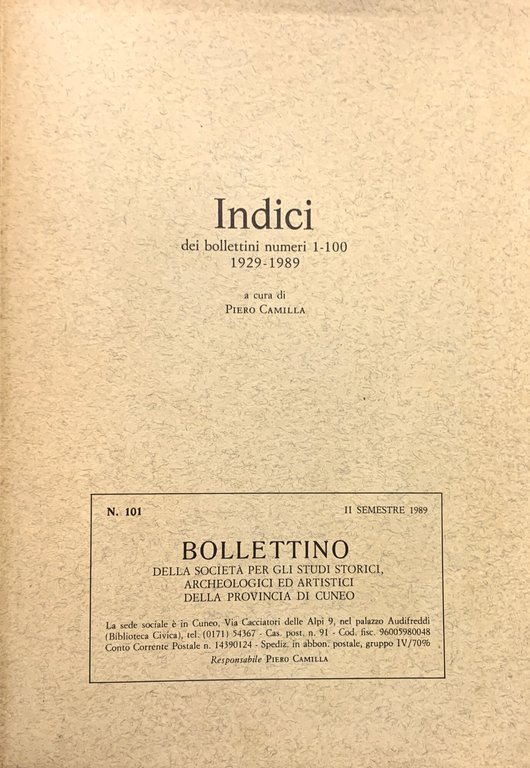 Indici dei bollettini numeri 1-100, 19129-1989 (Bollettino della Società per gli Studi Storici, Archeologici ed Artistici della Provincia di Cuneo (n. 101, II semestre 1989)