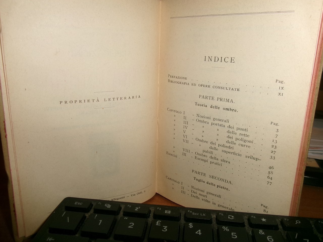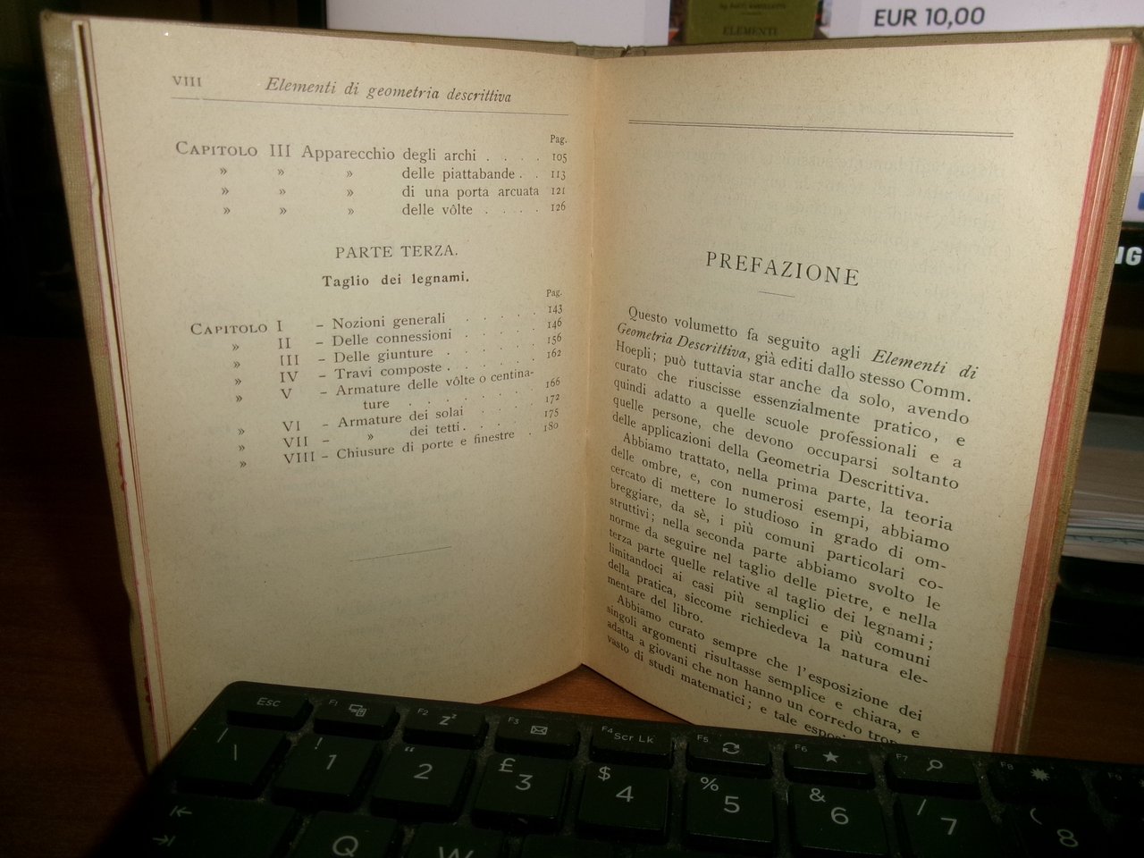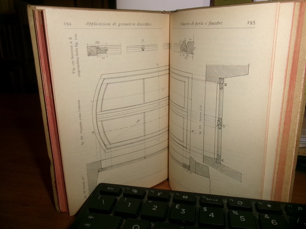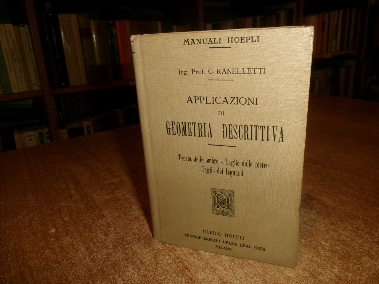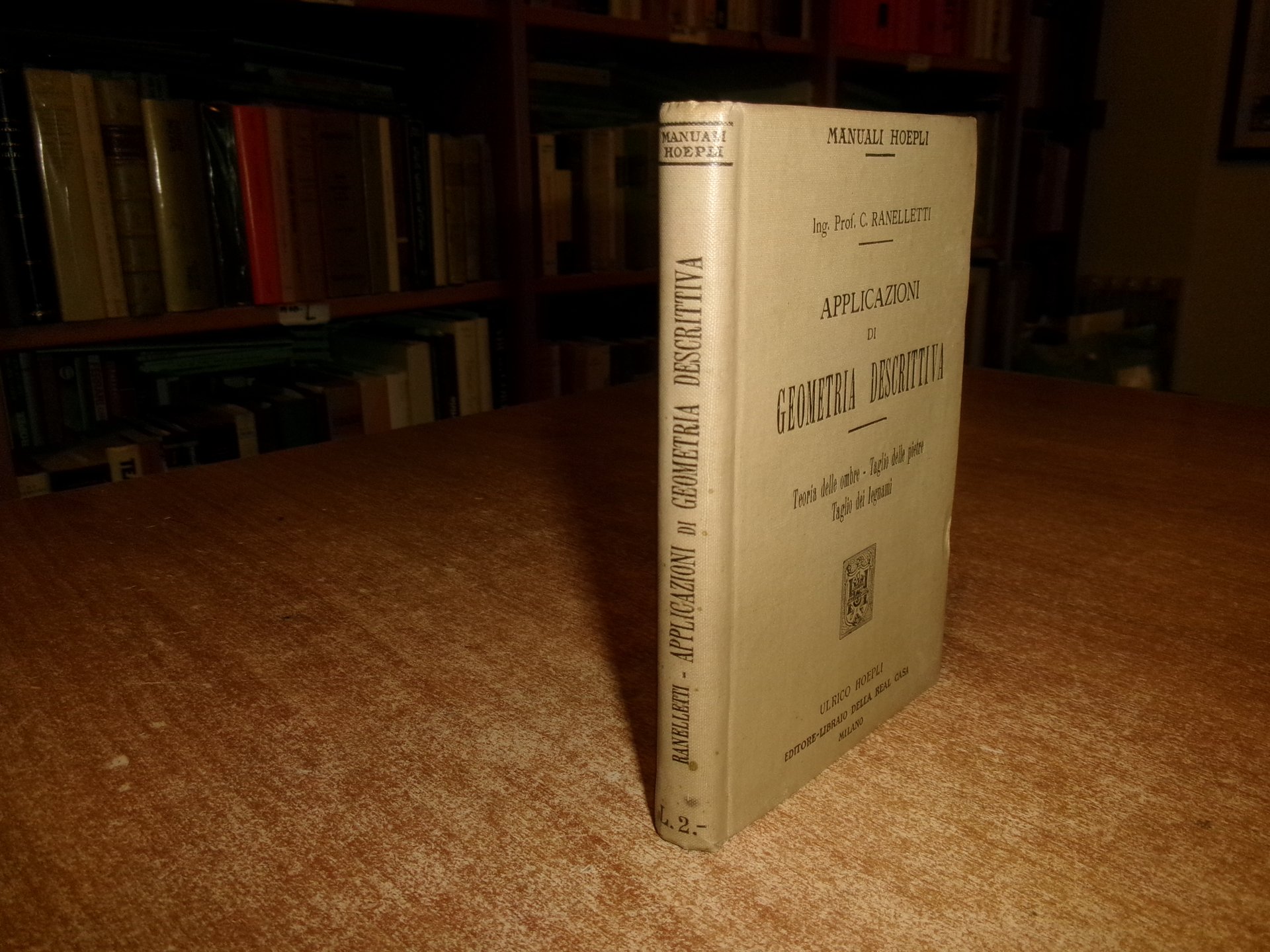 Ing. Prof. RANELLETTI. Applicazioni di GEOMETRIA DESCRITTIVA. Teoria delle ombre - Taglio delle pietre - Taglio dei legnami. Milano, Ulrico Hoepli, 1914. In-16°, tela edit. 201 pp. con 133 figure espressamente disegnate. Ben conservato. Neg. Hoepli mob. 19