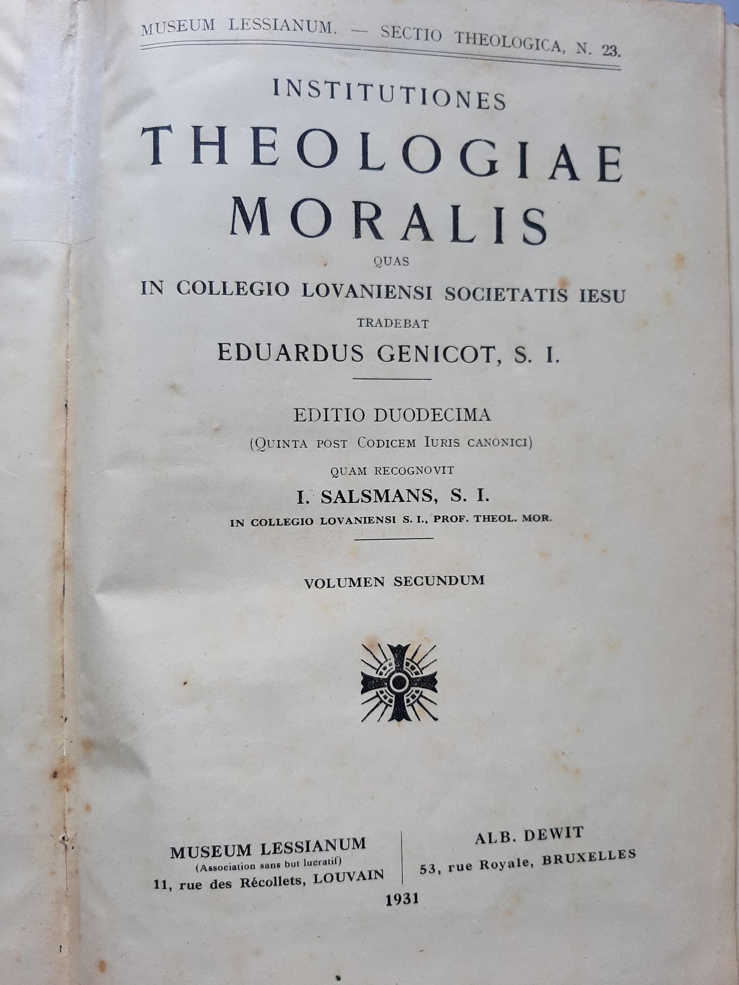 Institutiones theologiae moralis quas in Collegio Lovaniensis Societatis Iesu tradebat Eduardus Genicot, S.I., volumen secundum. Editio duodecima (quinta post Codicem Iuris Canonici) quam recognovit I. Salsmans, S.I. in Collegio Lovaniensis S.I.