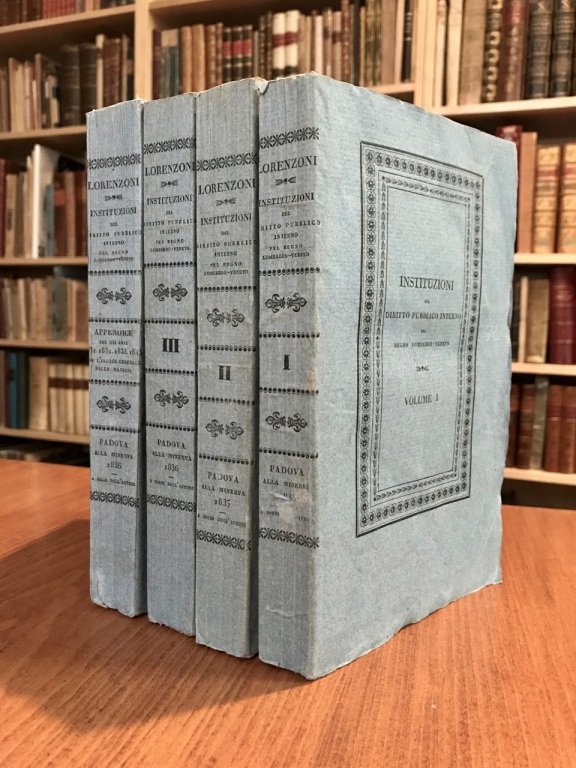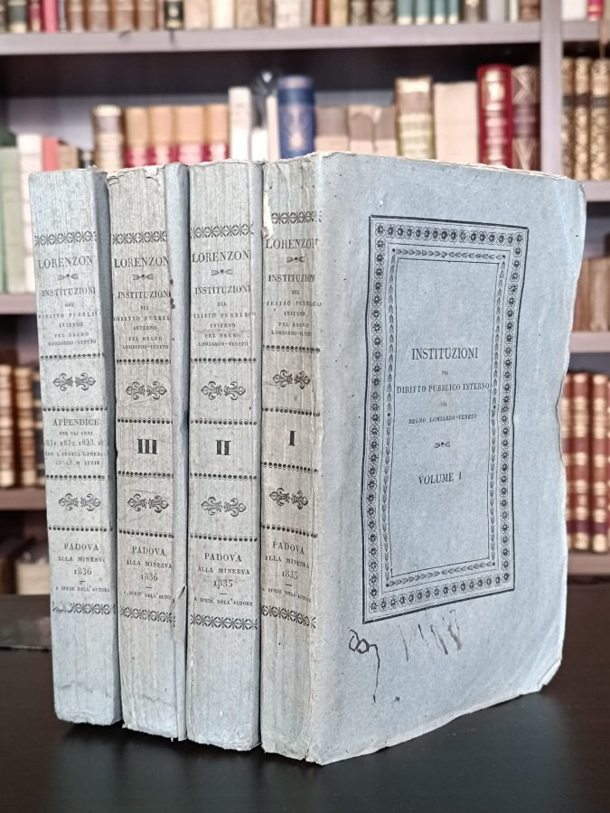 4 volumi in-8° (cm. 22,8), brossure editoriali a stampa azzurrine, titoli e fregi in nero ai dorsi e ai piatti inquadrati da cornici decorate con fregi floreali (lievi tracce d'uso e una d'inchiostro al solo piatto anteriore del vol. I, sbiaditura all'Appendice); carte in barbe, in ottimo stato (lievi e sporadiche fioriture). Edizione originale dell'opera migliore del giurista di Vicenza, con appendice per gli anni 1831-34 e Indice delle materie. Tratta delle leggi del Lombardo-Veneto dopo il Congresso di Vienna. Sull'autore, figura del foro vicentino. Cfr. Rumor II, 215.4. Esemplare molto buono. (NO3)