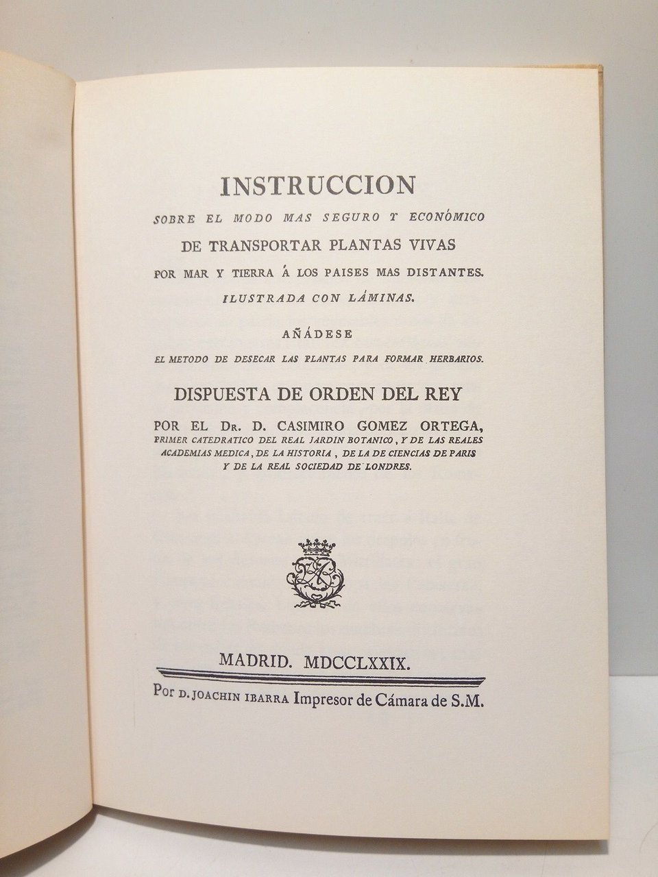 Instrucción sobre el modo mmás seguro y económico de transportar las plantas vivas por mar y tierra á los países mas distantes. Ilustrada con láminas. Añádese el método de desecar las plantas para formar herbarios / Dispuesta de Orden del Rey, por el Dr. Casimiro Gómez Ortega, Primer Catedrático del Real Jardín Botánico y de la Reales Academias Médica, de la Historia, de la de Ciencias de Paris y de la Real Sociedad de Londres. [PRESENTACIÓN DEL FACSIMIL por el Dr. Francisco Javier Puerto Sarmiento] | Libri antichi e moderni | Gomez Ortega, Casimiro (1741 - 1818)