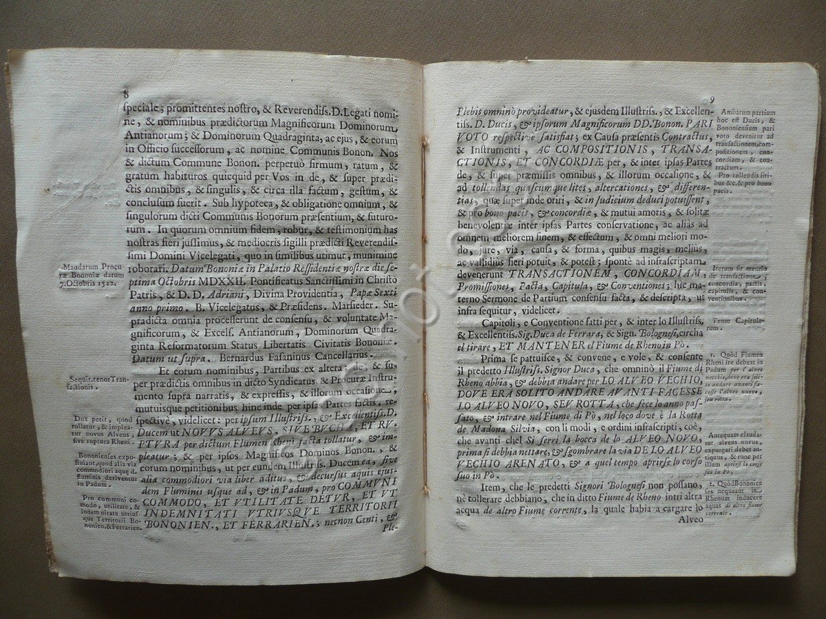 1522. Die quinta Decembris Instrumentum Transactionis inter Illustrissimus, & Excellentissimus D.D. Alphonsum Estensem Ducem Ferrariae, Mutinae, & Regii Ex una parte, et Civitatem Bononiae Ex altera Ex rogitibus D. Herculis Borgognini Notarii Bononiae, & D. Baptistae de Sarachis Notarii Ferrariae 1717, cm 25,5x19,5, pp. 16, legatura d'epoca in tutto cartonato con piccola nota numerica manoscritta al piatto ant. Introduzione in italiano, testo in latino. Condizioni di conservazione Esemplare in buone condizioni con tracce d'uso, alcune leggerissime bruniture, coperta con lievi tracce di sporco e tracce di pieghette agli angoli, dorso con piccoli strappetti d'uso. Interni buoni, complessivamente molto ben conservati, frontespizio con un minuscolo forellino e una minima mancanza all'angolo inf. Breve trattato d'idraulica relativo al fiume Reno. Si tratta della ristampa dell'atto del 1522, ripubblicato per dimostrare la verità delle asserzioni enunciate nell'ultima Scrittura de'Bolognesi pubblicata in quest'anno 1717. Cioè, che il Reno non cominciò ad andare nel Po del detto anno 1522, come asseriscono i Signori Ferraresi. Che nel detto tempo si mutò solamente il sito, o il luogo dello sbocco suo in Po, restituendolo all'Alveo vecchio: [.]" Esemplare molto raro. Breve introduzione in italiano, testo in latino. SC03.D9157 N "