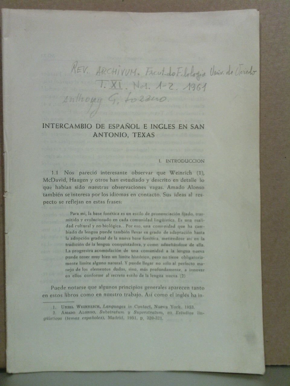 [Oviedo]:[Eds. de la Universidad], [1961].- P. 111-138 (en total 28 pags.); 4º (24 x 17,1 cm); Cubiertas provisionales.- Desglosado de la Revista "Archivum" Facultad de Filología de la Univ. de Oviedo. Tomo XI. Nos. 1-2, año 1961.* Al tratarse de un desglose carece de cubiertas y se le han puesto unas provisionales en papel. LENGUA ESPAÑOLA