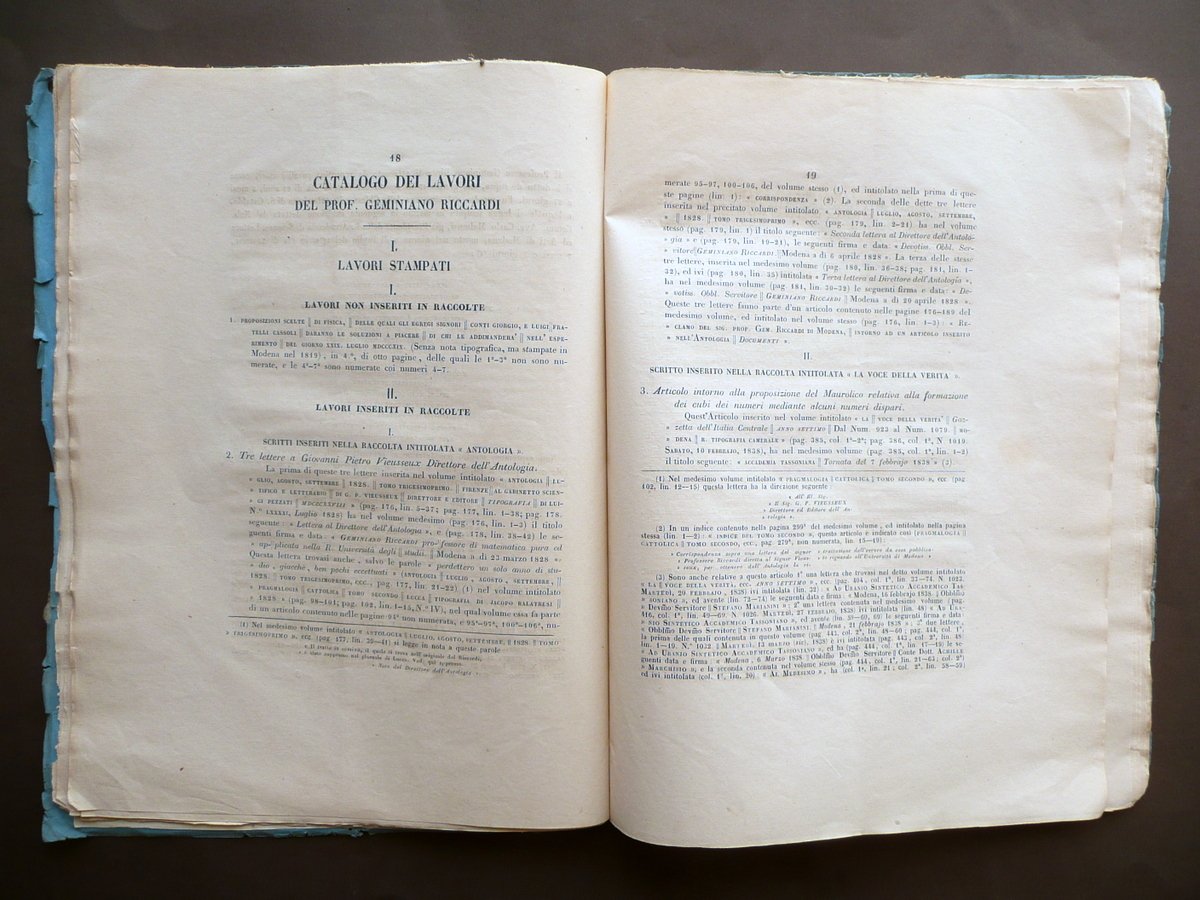 Luigi Lodi, Intorno Alla vita ed ai lavori del Prof. Geminiano Riccardi Cenni di Luigi Lodi Vice - bibliotecario della Biblioteca Estense di Modena Seguiti da due scritti inediti del medesimo Prof. Riccardi - Estratto dal Bullettino di bibliografia e di storia delle scienze matematiche e fisiche", tomo VIII - Gennaio 1875 Tipografia delle Scienze Matematiche e Fisiche, Roma 1875, cm 31,5x23,5, pp. 52; brossura ed. d'attesa. Margine sup. della brossura ant. con dedica a penna. Condizioni di conservazione Esemplare complessivamente ben conservato con tracce d'uso; brossure con alcune lievi bruniture; piccoli strappetti, pieghette e mancanze ai margini, angoli e cuffie; dorso e qualche margine con lievi ombre di gore che non interessano le pagine; lieve traccia di piega longitudinale; parte sup. della brossura ant. con una leggera macchietta. Interni buoni. SC03.D12406 N "