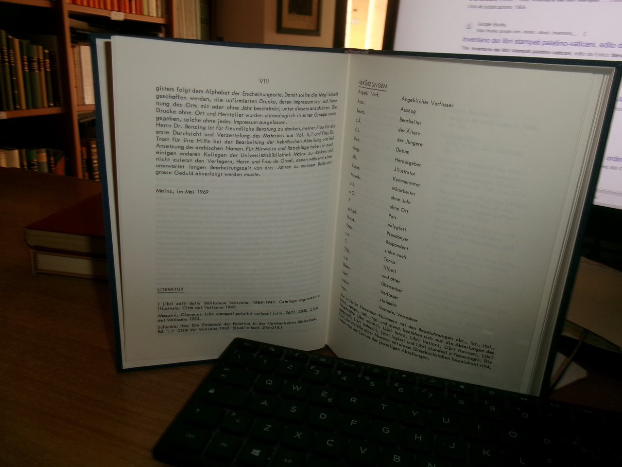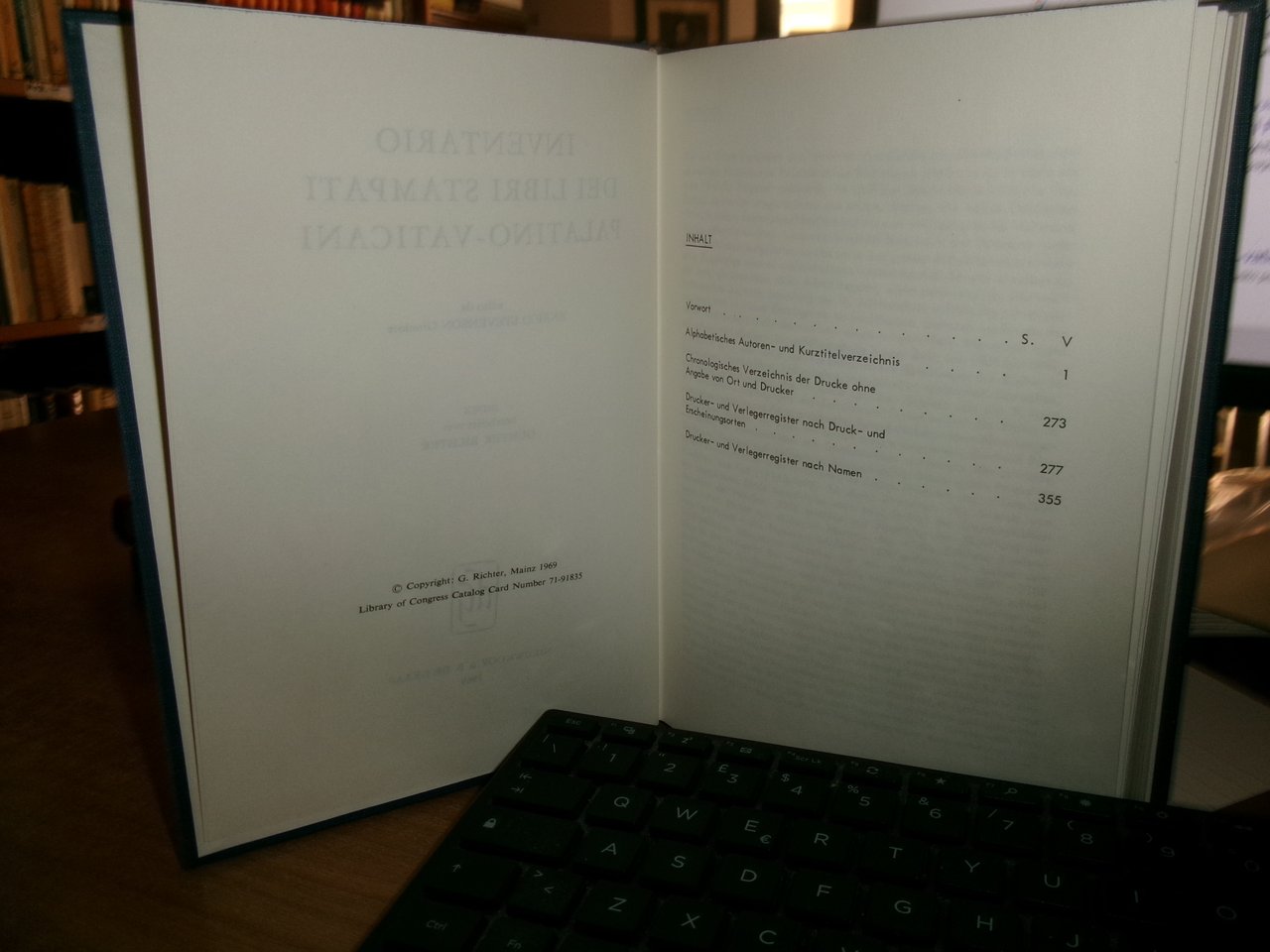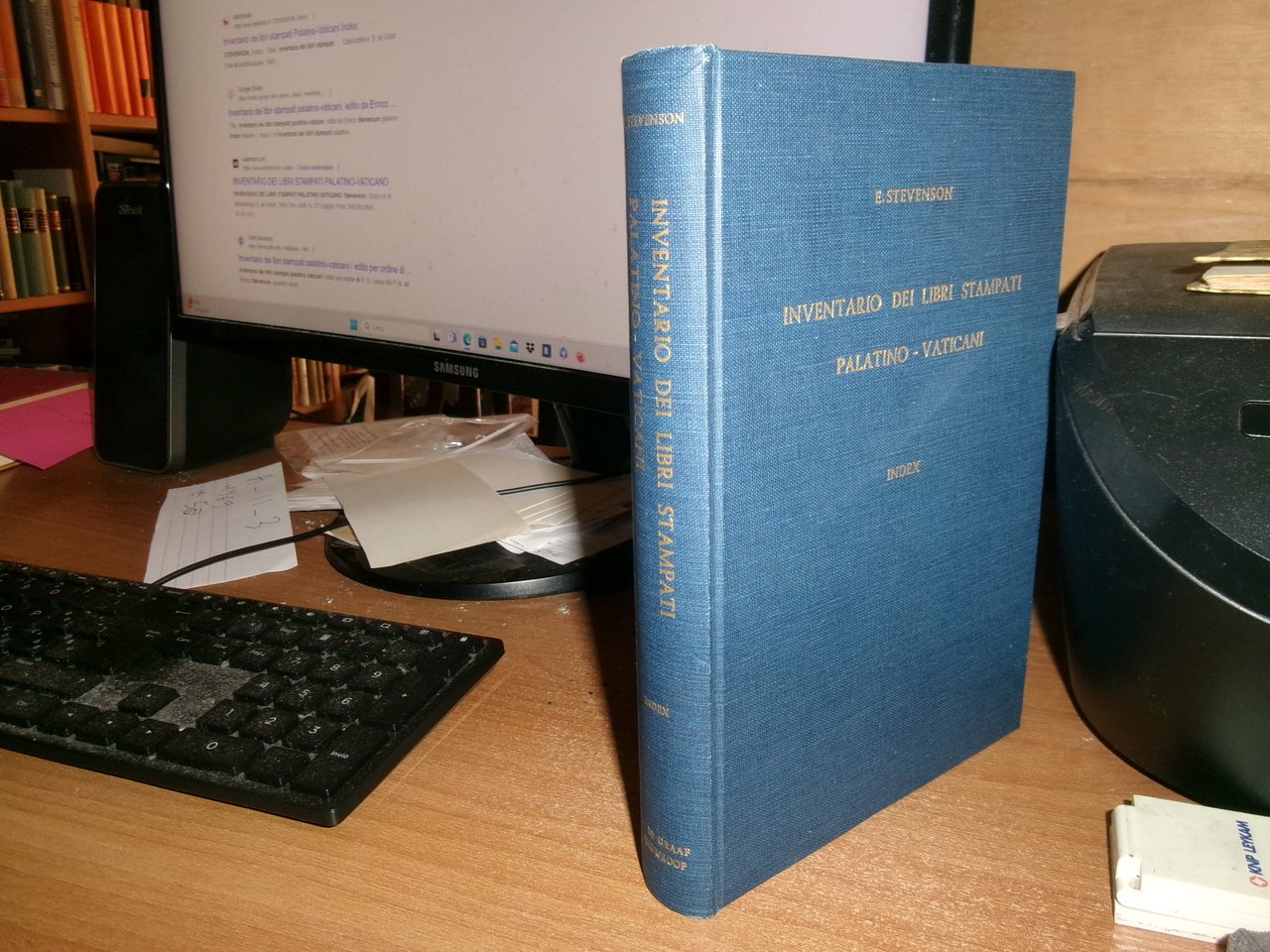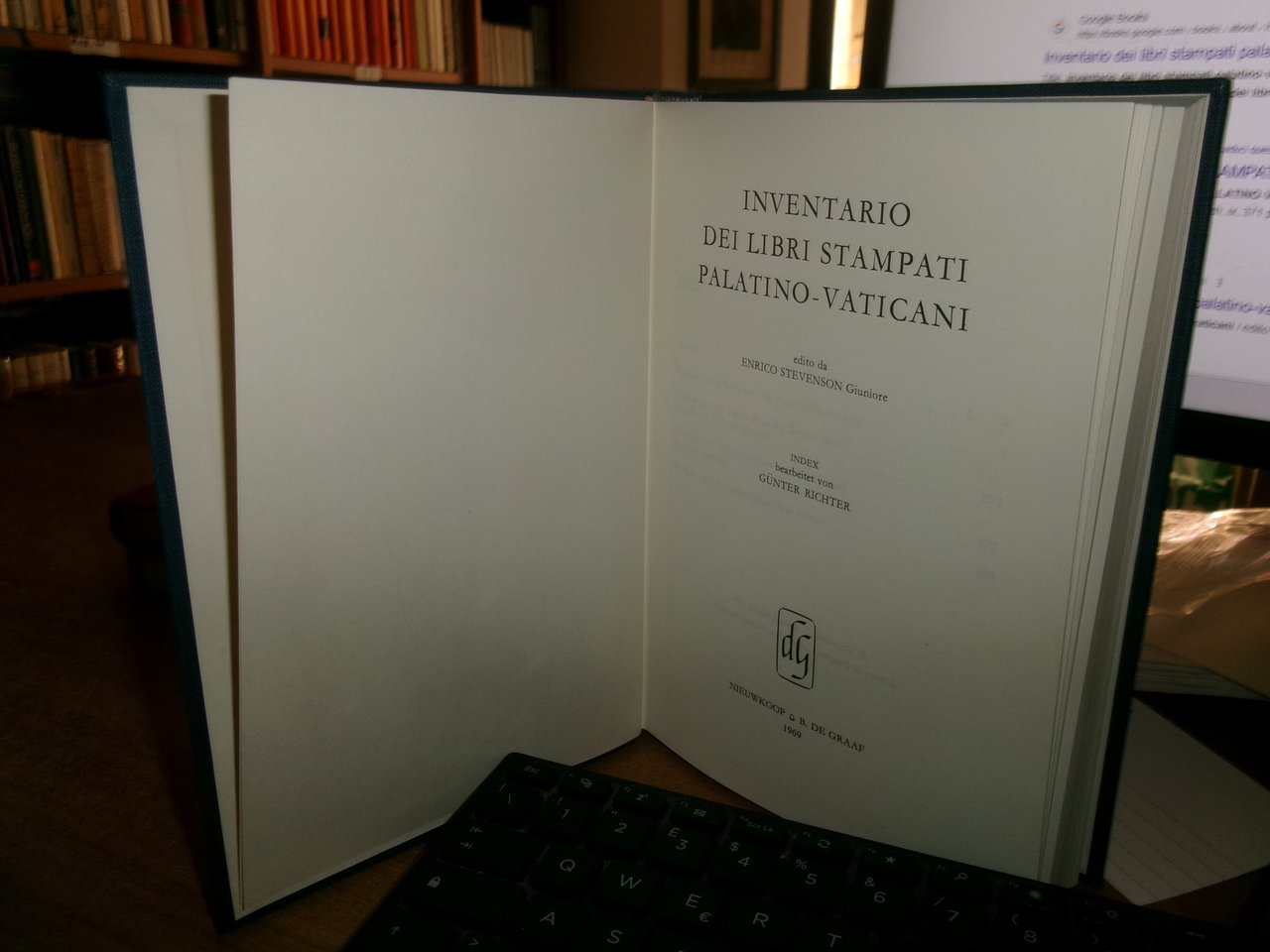 ENRICO STEVENSON Giuniore. Nieuwkoop & B. De Graaf.1969. INVENTARIO DEI LIBRI STAMPATI PALATINO-VATICANI. INDEX bearbeitet von GUNTER RICHTER. In-8°, tela edit. bleu con titoli in oro. viii, 371 pp. Come nuovo con testo in tedesco. Uff. A - II - 3