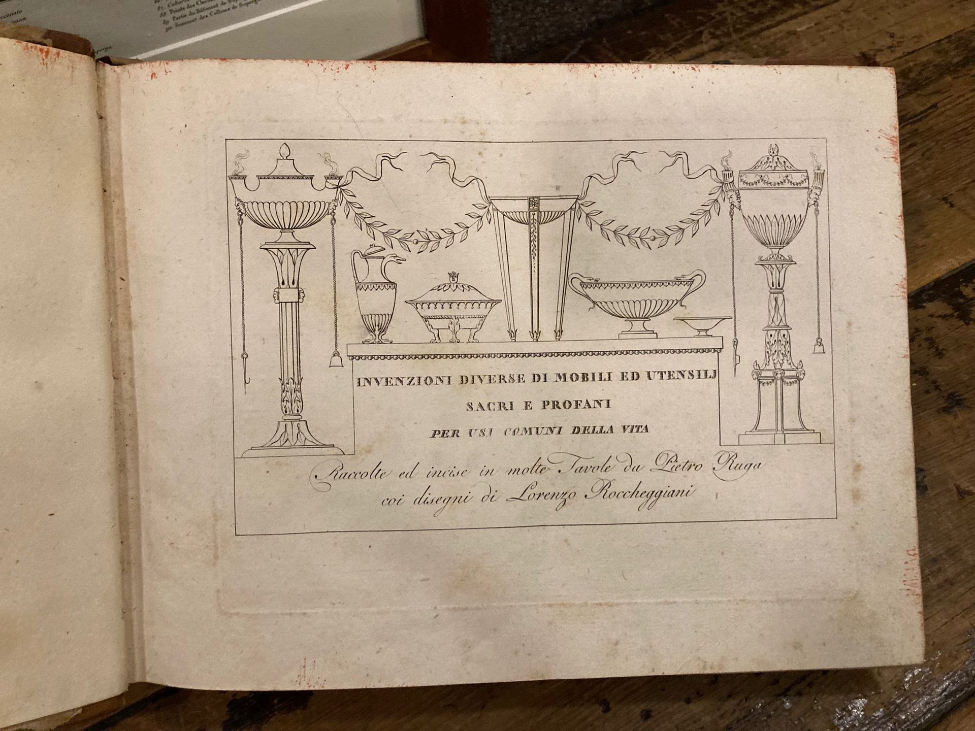 Invenzioni diverse di mobili ed utensili sacri e profani per usi comuni della vita raccolte ed incise in molte tavole da Pietro Ruga co' disegni di Lorenzo Roccheggiani