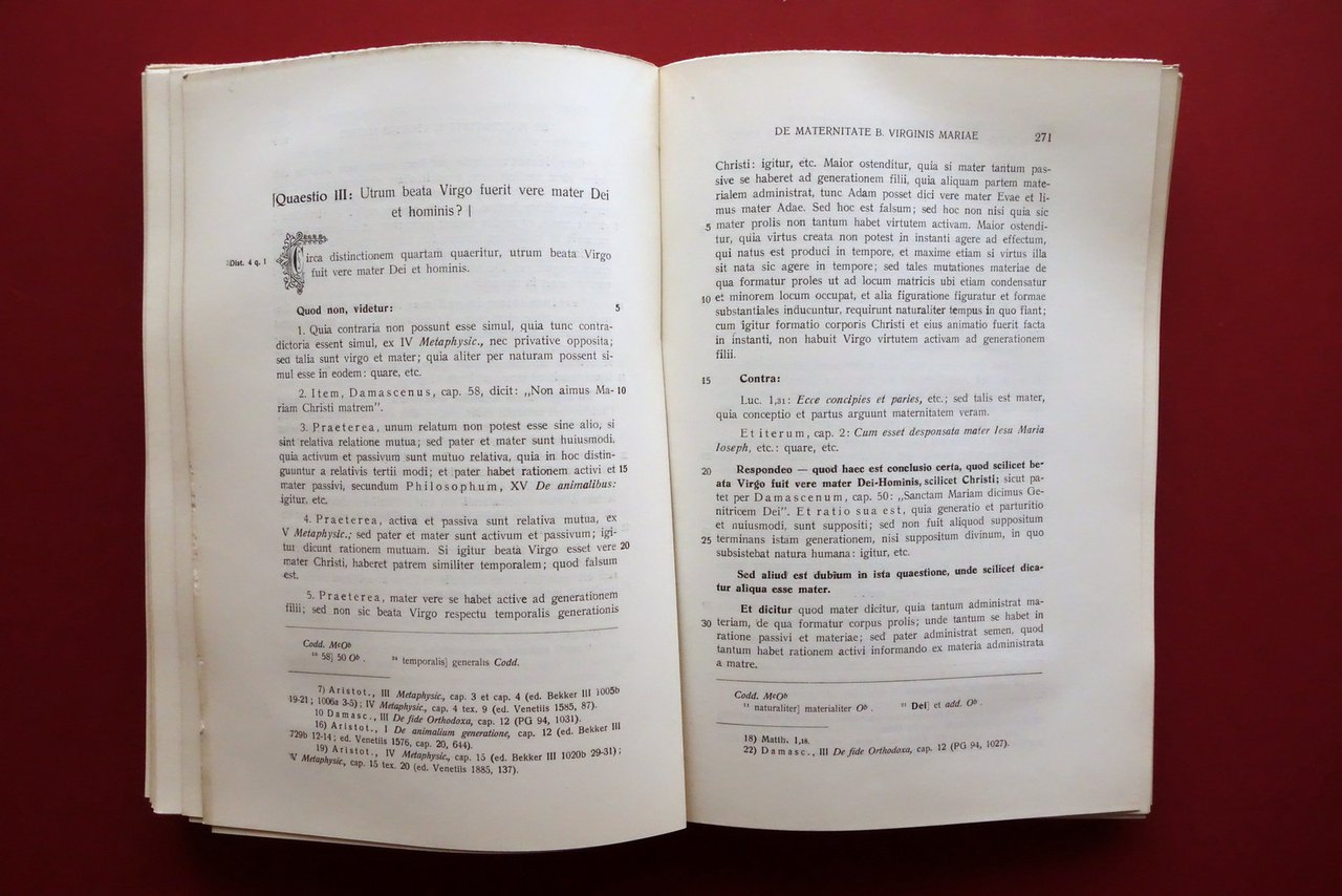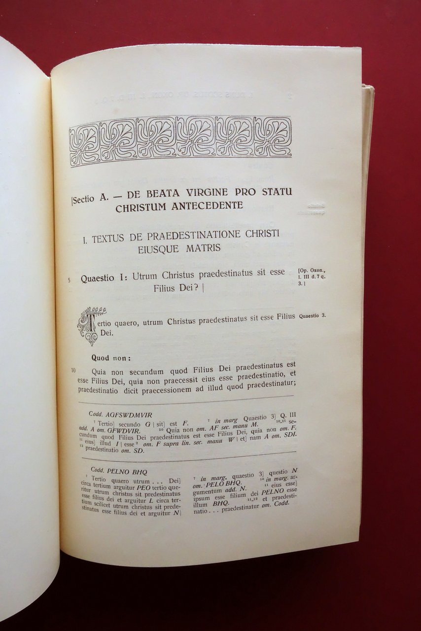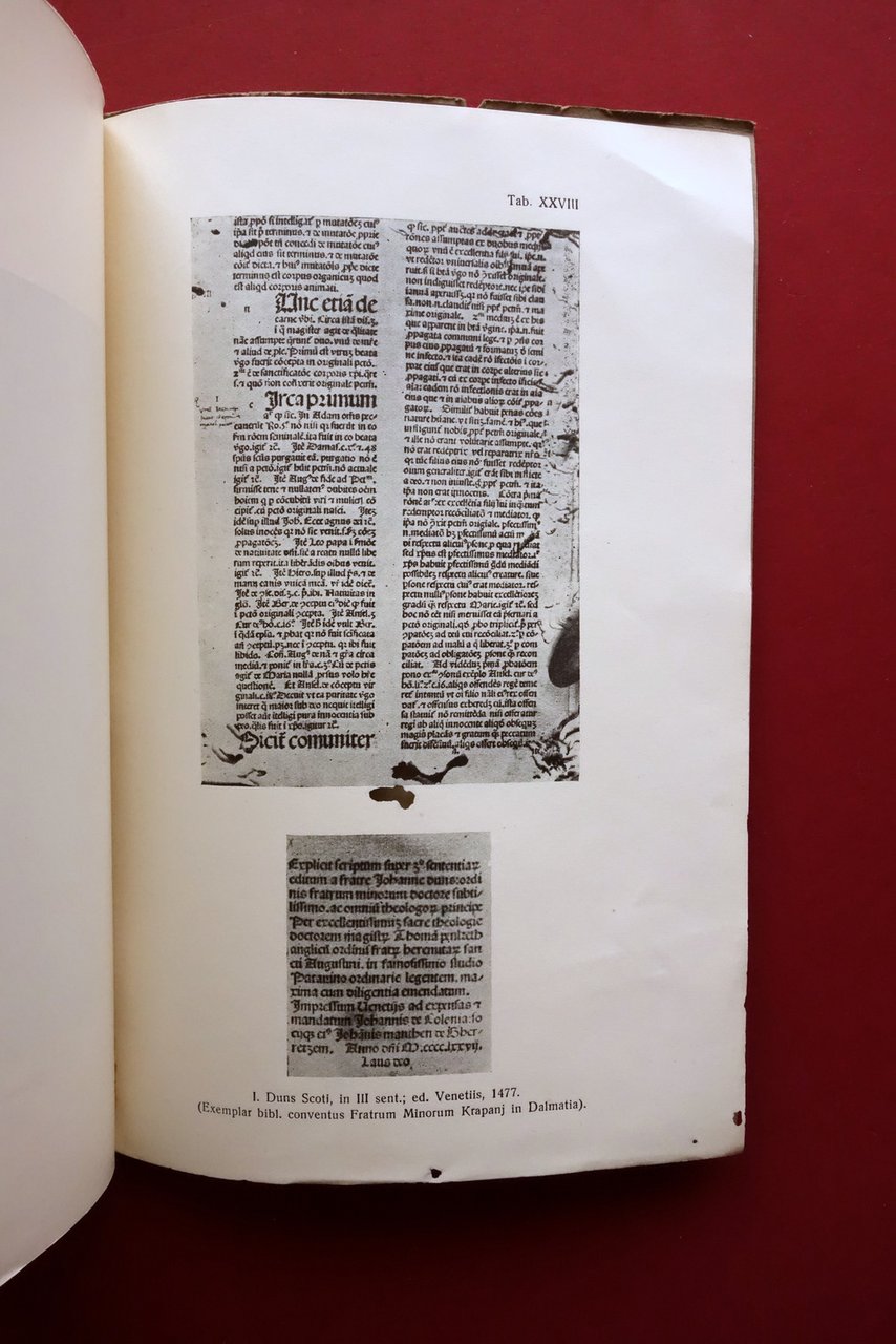 Ioannis Duns Scoti (doctoris mariani), Theologiae Marianae Elementa quae ad fidem codd. mss. edidit P. Carolus Balic, O. F. M. Ex Typographia Kacic, Sibenici (Sibenik in Jugoslavia) 1933; cm 24,5x16,5; pp. CLVI-454, pi√π XXVIII tavv. in b/n al termine del testo; brossura ed. All'antiporta timbro di biblioteca, esemplare regolarmente annullato. Edizione in lingua latina. Condizioni di conservazione Condizioni complessivamente buone con tracce d'uso, lieve ammaccatura all'angolo superiore (vedi foto); interni ben conservati con leggero allentamento delle cuciture di alcuni fascicoli, esemplare complessivamente compatto. Margine destro delle travole con qualche trascurabile mancanza alla parte inferiore; ultima tavola con poche minime mancanze, due delle quali interessano l'illustrazione (vedi foto). Rara edizione critica, con segnalazione delle varianti e dei manoscritti da cui provengono (vedi foto). Edizione in lingua latina. SETT231.L24608 N