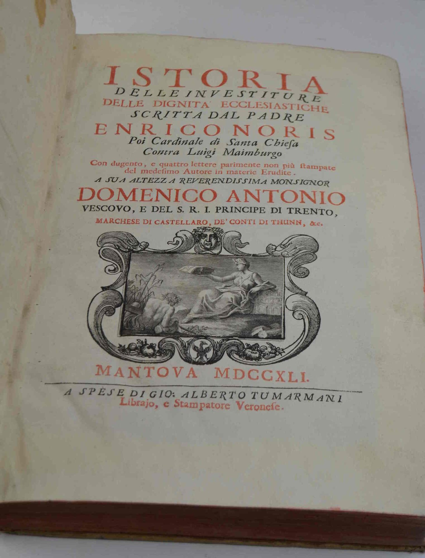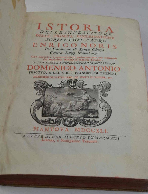 Cm. 37, pp. (14) + 758 + 380 (2) num. per colonne. Bellissima antiporta figurata, frontespizio in rosso e nero con vignetta centrale, ritratto a piena pagina del Principe Vescovo di Trento Domenico Antonio cui l'opera è dedicata, due grandi testate e capolettera istoriati. Il tutto finemente inciso in rame (Fr. Zucchi). Legatura coeva in piena pergamena rigida con titoli impressi al dorso. Qualche segno d'uso sparso ma complessivamente esemplare marginoso e ben conservato. Alcune figure xilografiche sono presenti nel testo delle lettere (prevalentemente di medaglie). Edizione originale. postuma di un'opera scritta nel 1764-65 "in occasione dei romori tra la Santa Sede e la Francia per le Regalie de' Vescovadi". Franceso Bianchini ebbe il manoscritto quando morì il Card. Noris e lo diede a Clemente XI. Quest'ultimo lo passò a Giusto Fontanini che è il curatore ed il copiatore di quest'edizione.