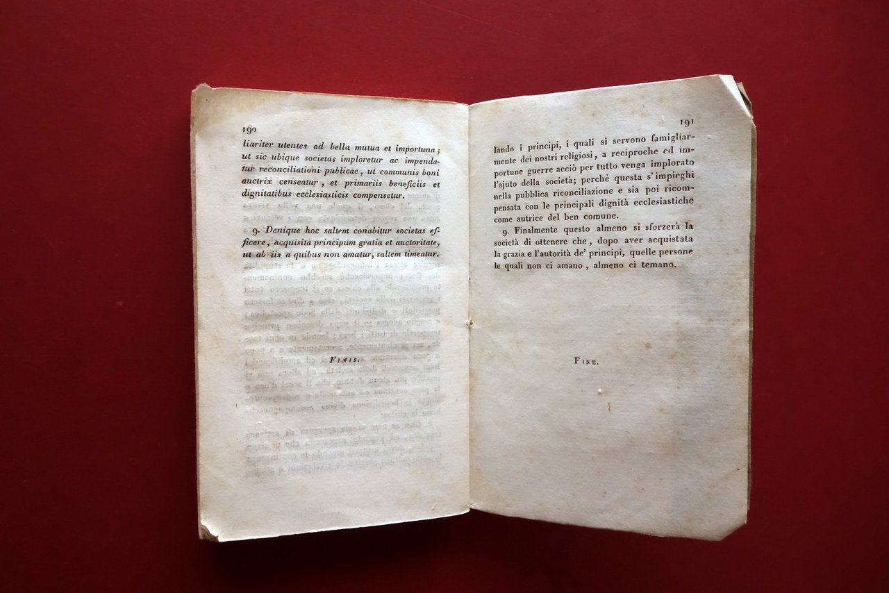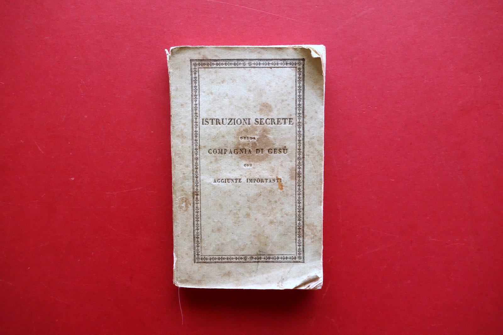 Anonimo, Istruzioni secrete della Compagnia di Gesù con aggiunte importanti - testo bilingue latino - italiano Tip. della Propaganda, Roma, s. d. ma metà '800 circa; cm 13x8,5; pp. 192; brossura ed. d'attesa. Condizioni di conservazione Buone condizioni con tracce d'uso e leggeri segni del tempo, brossura con alcune bruniture, pieghette agli angoli, al dorso poche minime mancanze, cerniera ant. con fessurazione di un paio di cm alla parte superiore. Interni buoni con leggero foxing; angoli di alcune pagine con minime pieghette. Testo bilingue latino - italiano. SETT157.L25790 N P