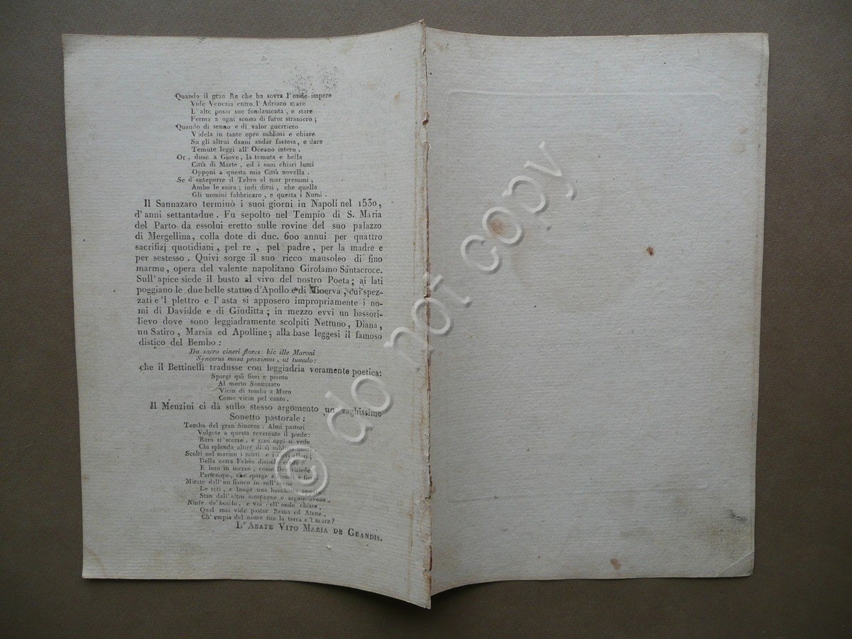 Biografia, Jacopo Sannazaro Celebre Poeta Nacque in Napoli il di 28 Luglio 1458 Morì nel 1530 Presso Nicola Gervasi, in Napoli, s.d. (primo Ottocento circa), cm 26x18, pp. non num. (pp. 4) con un ritratto del Sannazaro inciso all'antiporta. Condizioni di conservazione Esemplare in buone condizioni con tracce d'uso, alcuni leggeri aloni e bruniture, dorso con tracce di precedente inserimento entro volume. Tale biografia proviene dall'Opera di Nicola Gervasi intitolata Biografia degli uomini illustri del Regno di Napoli" (edita a partire dal 1814). "