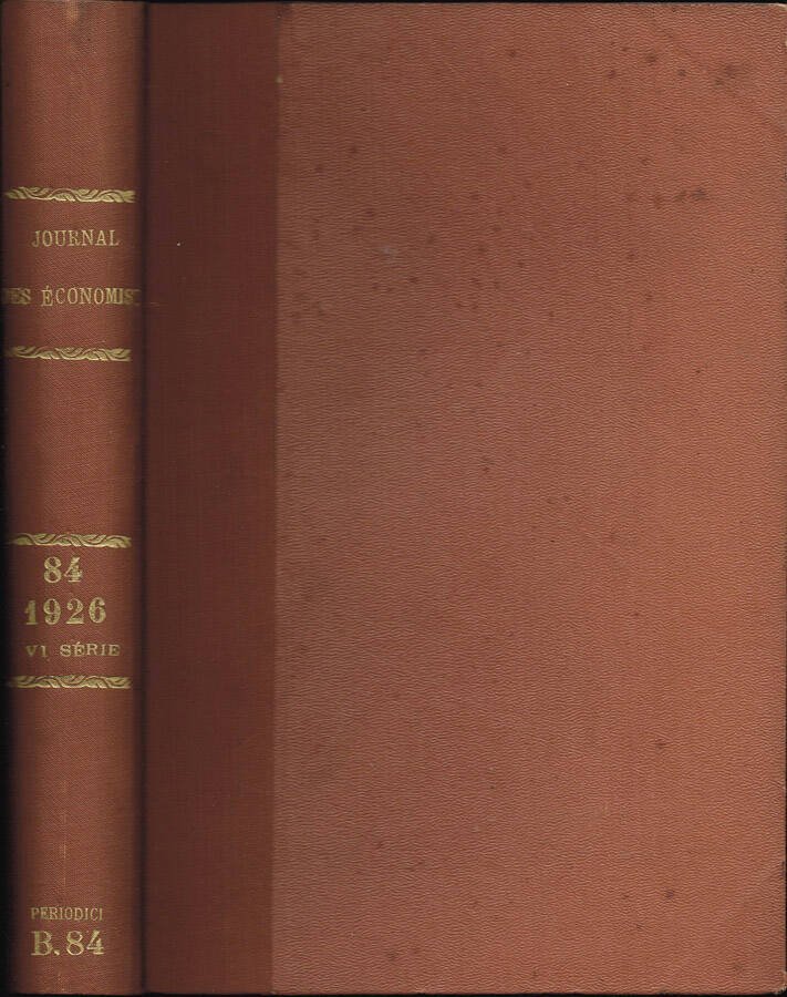 Anno 1926 incompleto, presente Tomo LXXXIV, da aprile a giugno, LXXXV.o anno del periodico Journal des Economistes - Revue mensuelle de la Science Economique et de la Statistique - 6.e Série, fondato da Gilbert Guillaumin, redattore capo: Yves Guyot. Volume degli anni '20 del '900 in stato discreto, rilegato con coperta, non coeva, in mezzatela con angoli, piatti in similpelle, dorso con fregi e caratteri dorati in bassorilievo, bordo leggermente sfregato, lievi abrasioni, tracce di fioritura sparsa, tagli leggermente ambrati, quello di testa di colore bordeaux, pagine in buono stato, alcune e margini poco ambrati, minima presenza di gora. Il rilegatore ha mantenuto all'interno del volume il piatto anteriore originale, in cartoncino, con catalogazione bibliotecaria manoscritta ed appunto a matita. Numero Pagine 448