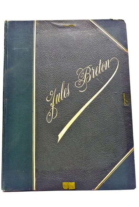 5 feuillets, dont le frontispice. 153 pages. 5 feuillets. 91 planches hors-texte. (36x26 Cm). En feuilles sous chemise cartonnée. Demi-toile vert. Titre et lacets dorés sur les plats. Exemplaire non destiné au commerce. Imprimé spécialement pour Monsieur Emile Michel, peintre et critique d'art français. Autoportrait de l'artiste en frontispice. Jules Breton, de formation académique, peintre réaliste puis naturaliste, fut l’un des premiers artistes du monde paysan. Son art prend naissance vers 1848, période de forts bouleversements sociaux et politiques. La montée de l'industrialisation provoque un exode des campagnes vers les villes et suscite chez les intellectuels, les artistes, une prise de conscience du peuple dans sa vie ordinaire. Exemplaire très richement illustré. Traces d'humidité.