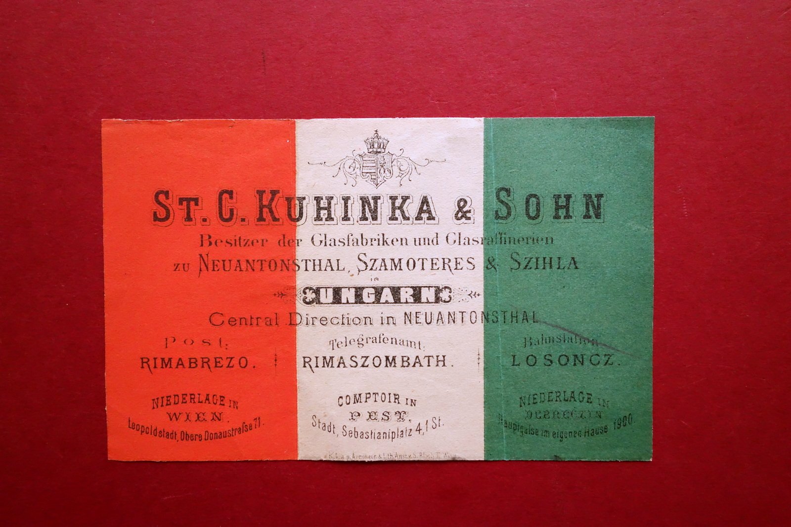 Volantino pubblicitario, St. C. Kuhinka & Sohn besitzer des Glasfabriken und Glasraffinerien zu Neuantonsthal Szamoteres & Szihla in Ungarn [.] S. d. ma primo Novecento circa; volantino pubblicitario cartaceo a stampa, testo su sfondo tricolore. Retro bianco. testo in tedesco. Cm 8,5x14. Condizioni di conservazione Buone condizioni con un paio di leggere tracce di pieghe. Per maggiori dettagli vedi foto. Originale. SC03.D18659 N BIS