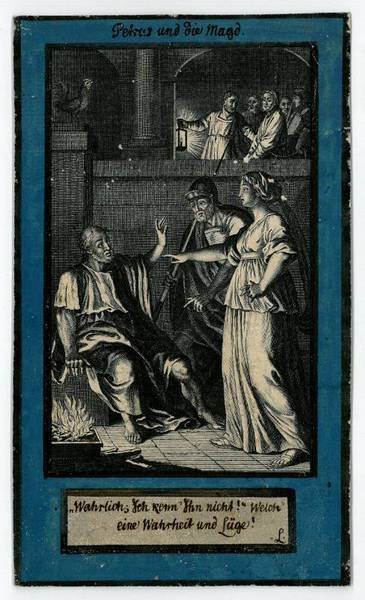 Stich (85 x 135 mm), aufgezogen auf Kartonträger (109 x 184 mm) mit schwarzer Tuschumrahmung und blauem Originalkolorit. Überschrieben "Petrus und die Magd": die Verleugnung Christi durch Simon Petrus (Mk 14,66-71), hier montiert als physiognomisches Anschauungsmaterial. Unter dem Stich montiertes, signiertes Etikett: "'Wahrlich; Ich kenn' Ihn nicht!' Welche eine Wahrheit und Lüge!". - Lavater versuchte, die Physiognomik gleichsam zu einer Wissenschaft vom inneren Menschen zu erheben: Aus der Bildung der äußeren Körperteile, besonders des Gesichts, sollte auf die seelischen Eigenschaften geschlossen werden. Sein theoretisches Werk dazu, das 1775-78 erschien, hatte außergewöhnlichen Einfluss auf viele Zeitgenossen, außer auf Herder und Jacobi auch auf seinen zeitweiligen Freund Goethe, während Lichtenberg ("Fragment von Schwänzen") und Nicolai Lavaters orakelhafte Theorien heftigst kritisierten.