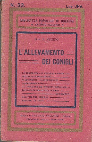 In-16°, pp. 110, (2), brossura editoriale rossa riquadrata. 28 incisioni n.t. Buon esemplare. Cenni sulle conigliere, le razze di conigli, la loro riproduzione, l'allevamento, l'allevazione, la conciatura delle pelli, le malattie del coniglio, le cavie, ecc. Piccola Biblioteca di Coltura.