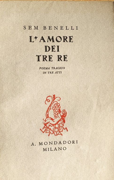 III ed.: maggio 1934 - XII (I ed.: Milano, Treves, 1909 - I ed. Mondadori: 1932. L'opera fu rappresentata per la prima volta a Roma al Teatro Argentina la sera del 16 aprile 1910 dalla Compagnia Stabile di Roma) con tiratura limitata su carta a mano di Maslianico, recante in filigrana la sigla "Amor vendemmia", composto con caratteri "Polifilo" e curato nel testo da Angelo Sodini, è stato impresso in una edizione di lusso di 650 esemplari numerati in cifre arabe (esemplare numero 388). VIII/ (8)+136/ bross./ sovraccoperta in carta ruvida grigia con titoli in nero e con motto figurato in rosso al primo piatto ("Amor vendemmia"). Con la riproduzione in fac simile di tre manoscritti dell'A.(Una osservazione sul verso dell' "Amore dei Tre Re" - L'Amore dei Tre Re. Saggio dei primissimi abbozzi (Atto II)) in due tavole di cui una ripiegata. Stato buono (manca la seconda sovraccoperta in carta lucida trasparente - lieve usura e brunitura della sovraccoperta - quasi interamente intonso).
