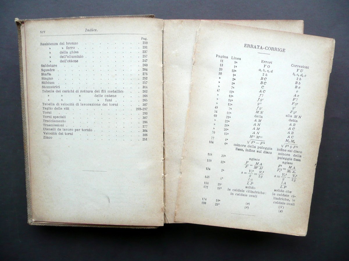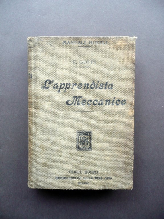 Carlo Goffi, L'Apprendista Meccanico Nozioni elementari di disegno geometrico e meccanico, di meccanica e di macchine a vapore Principali metalli usati nelle industrie meccaniche, loro resistenza e loro lavorazione Con 203 incisioni Hoepli, Milano 1914, cm 15x10,5, pp. XVI; 316 con 203 fig. in b/n nel t. e fuori t. (qualcuna anche su due pagine); tutta tela ed. con titolo al dorso e al piatto ant.; tagli rossi. Frontespizio con vecchio timbretto. Condizioni di conservazione Esemplare in buone condizioni con tracce d'uso, coperta con alcuni leggeri aloni e tracce di sporco, angoli dei piatti con pressoché trascurabili strappetti. Interni complessivamente buoni con alcune piccole lievi bruniture e, a poche pagine, qualche leggero alone; cerniera interna ant. leggermente fessurata con conseguente minimo allentamento delle cuciture dei primi due fascicoli, esemplare compatto; pp. 131-132 con qualche traccia di piega (vedi foto); poche pagine con qualche segnetto d'epoca a matita; pp. 15-16 (errata corrige") staccate dal corpo del testo. Prima edizione (1914). SETT114.L10894 N P "