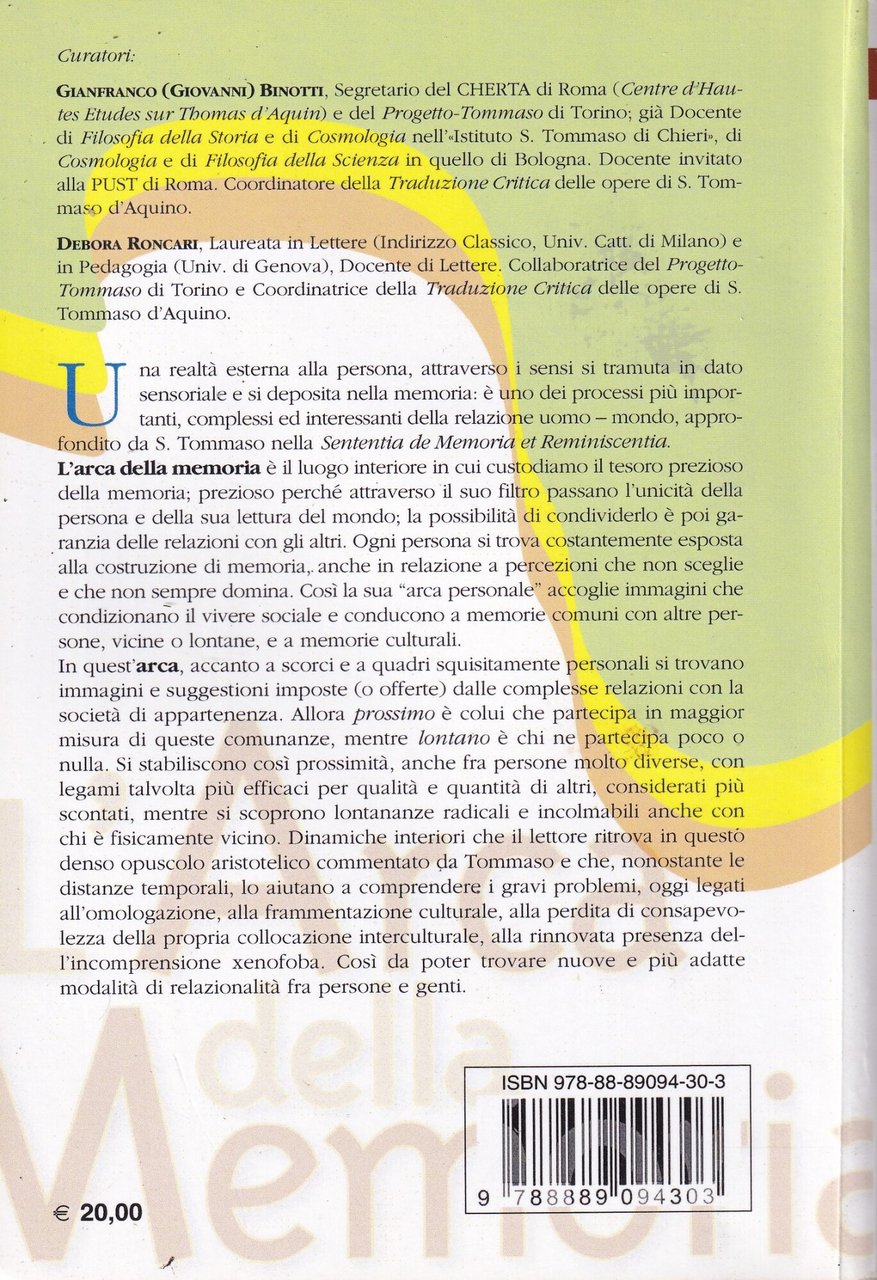 L'arca della memoria. La sentenza sulla memoria e la riminiscenza di Aristotele | Libri antichi e moderni | Tommaso, d''Aquino (san)