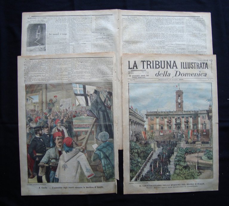 Rivista, A Candia-L'assemblea degli insorti consacra la bandiera di Candia " Grande illustrazione a colori alla prima e alla ultima pagina di copertina de "La Tribuna Illustrata" 6 marzo 1898 Roma 1898, cm 43x30, pp. 8 (numerazione progressiva annuale) con numerose ill. in b/n nel testo. e con due grandi ill. a colori alla prima e all'ultima pagina. Numero completo. Condizioni di conservazione Esemplare in buone condizioni con tracce d'uso, alcune piccole lievi bruniture; margini e angoli con qualche minima imperfezione, fogli sciolti per mancanza delle cuciture, prima e ultima pagina di copertina con piccole abrasioni al dorso e distacco (vedi foto), piega centrale conservativa. Numero completo. Ulteriori dettagli all'articolo interno. SC03.D4645F blu "