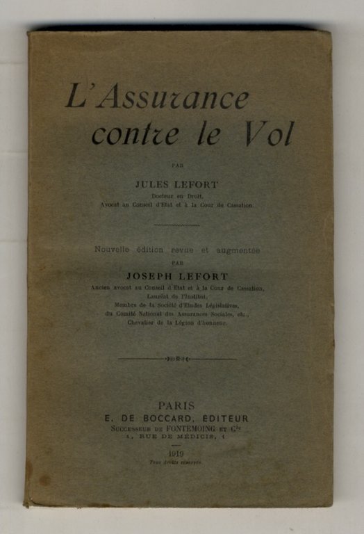 L'Assurance contre le Vol. Nouvelle édition revue et augmentée. | Libri antichi e moderni | Lefort Jules.