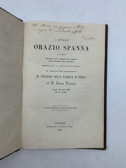 L'avvocato Orazio Spanna da Torino. Ripetitore nel R. Collegio Carlo Alberto per gli studenti delle Provincie presentava a pubblica discussione per conseguire l'onore dell'aggregazione al Collegio della Facoltà di leggi nel R. Ateneo Torinese il giorno 26 aprile 1860 alle ore 8 antim. | Libri antichi e moderni | SPANNA Orazio