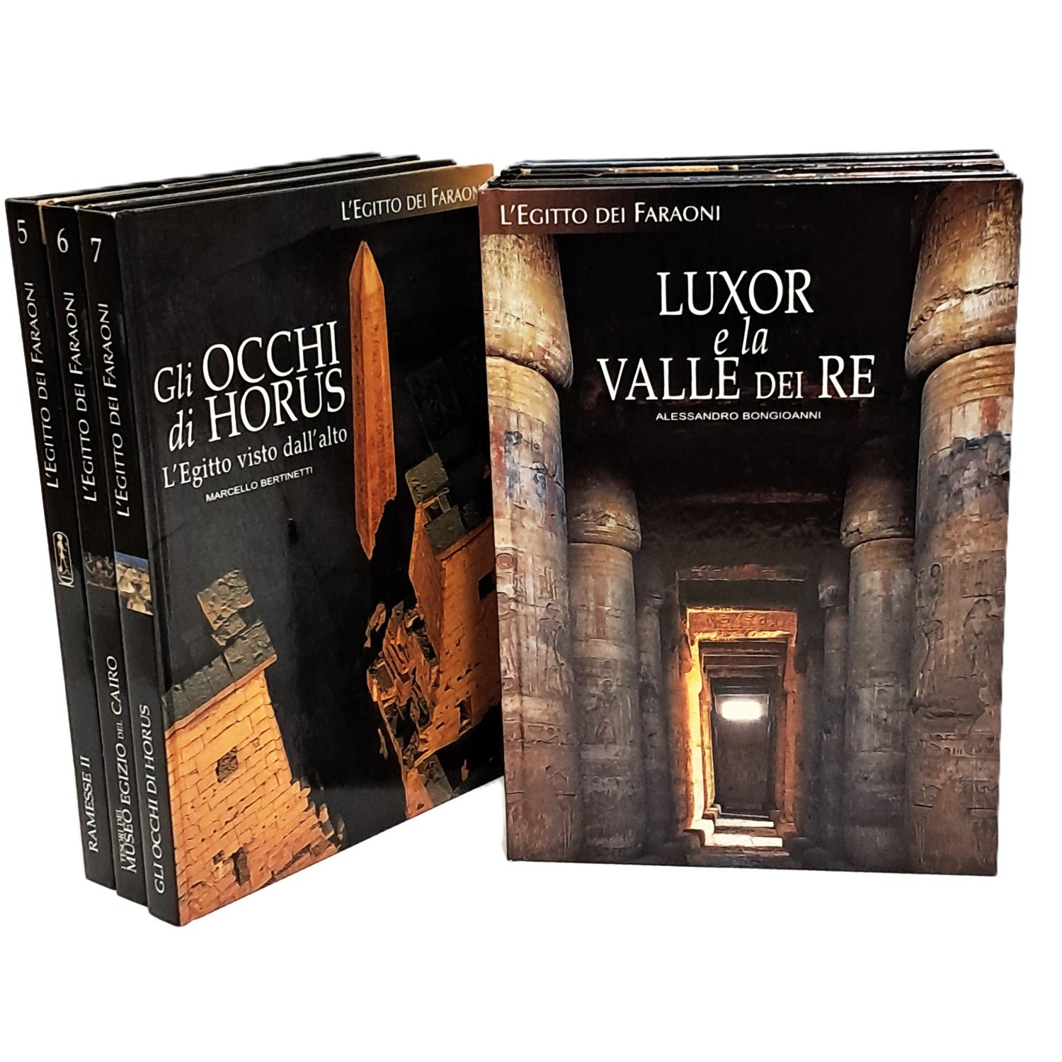 PRIMA EDIZIONE edita per il gruppo editoriale L'Espresso, opera in sette volumi Opera divulgativa curata da diversi autori: Luxor e la valle dei re di Alessandro Bongioanni (pp. 287); Piramidi di Corinna Rossi (pp. 287); Abu Simbel e i templi nubiani di Marco Zecchi (pp. 285); Tutankhamon di T. G. Henry James (pp. 311); Ramesse II di T. G. Henry James (pp. 311); I tesori del museo egizio del Cairo di Alessia Amenta (pp. 287) e Gli occhi di Horus di Marcello Bertinetti (pp. 308). Cartonati con splendide foto. Come nuovo.